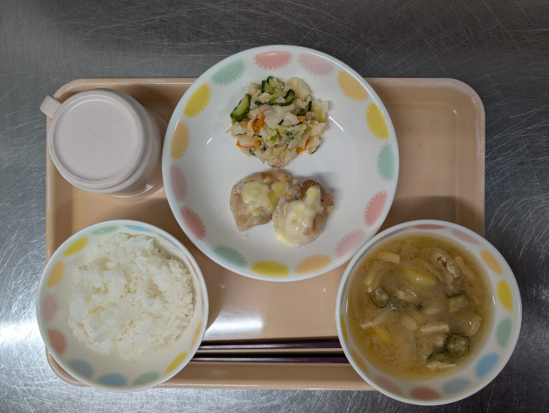 今日のメニューは、ご飯、鶏肉のチーズ焼き、キャベツと人参のサラダ、さつま芋の味噌汁です😊