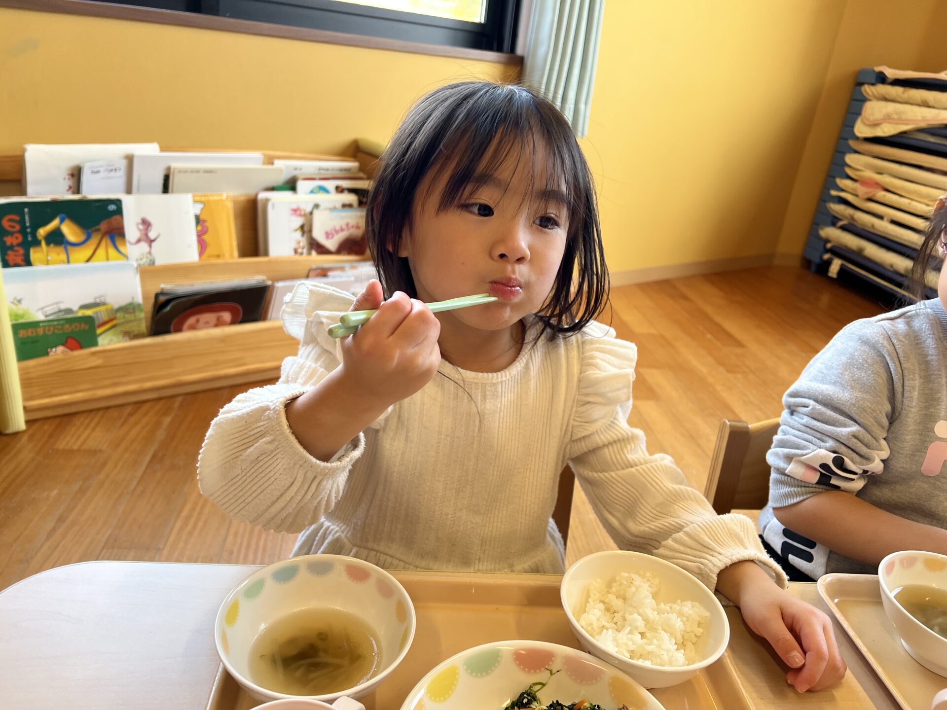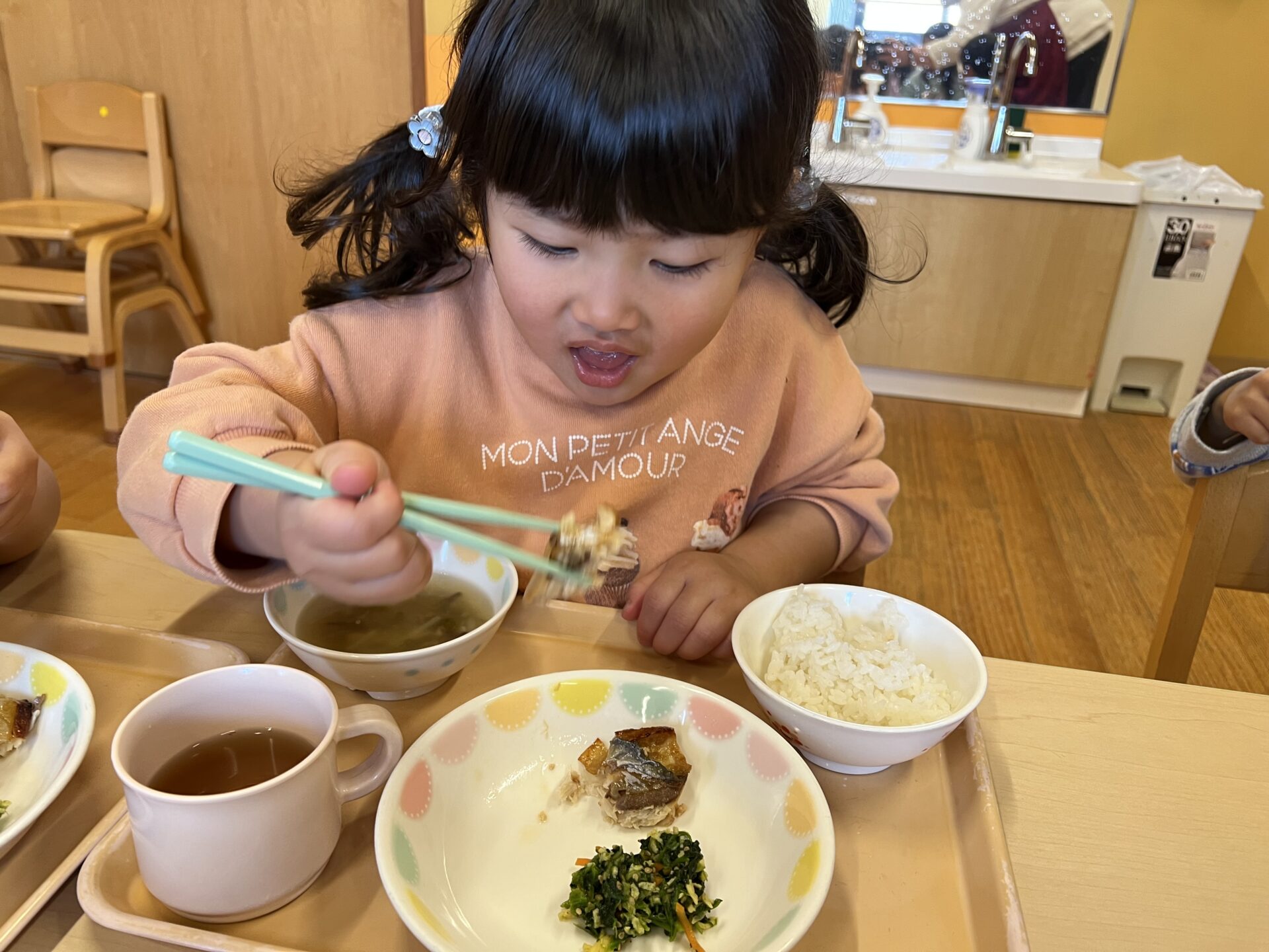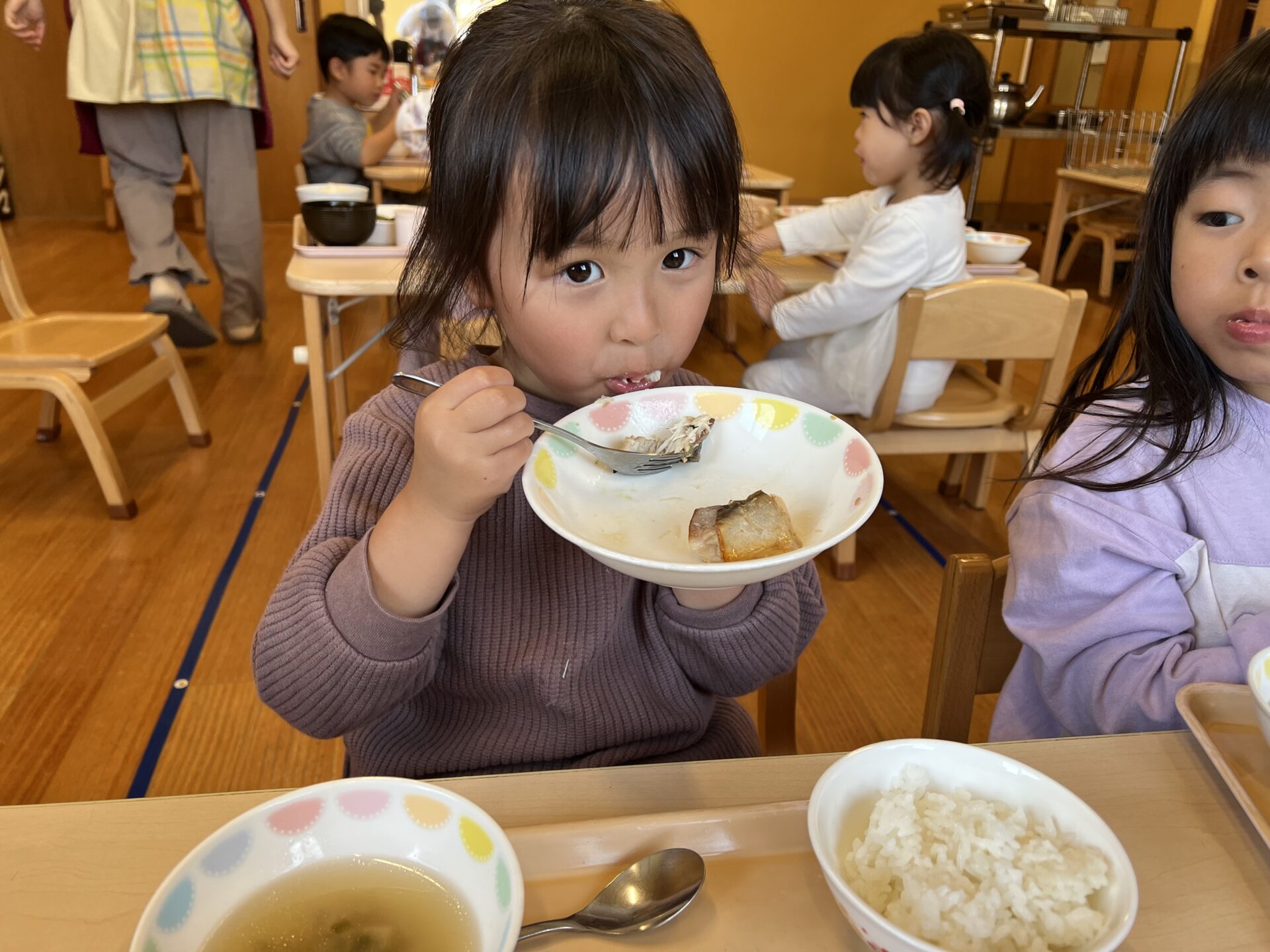 にじチームさんは、「お魚が美味しかった💗」という子と「お野菜が美味しい💗」「中華スープが美味しい💗」と好きなものがバラバラでしたが、全部ピカピカに食べていました😊