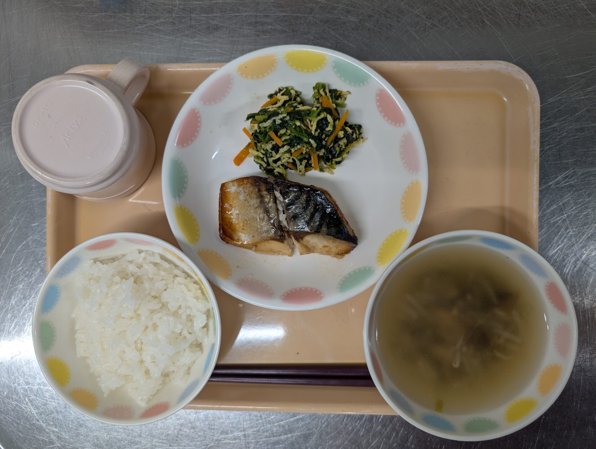 今日のメニューは、ご飯、さばの照り焼き、ほうれん草と卵のナムル、中華スープです😊
