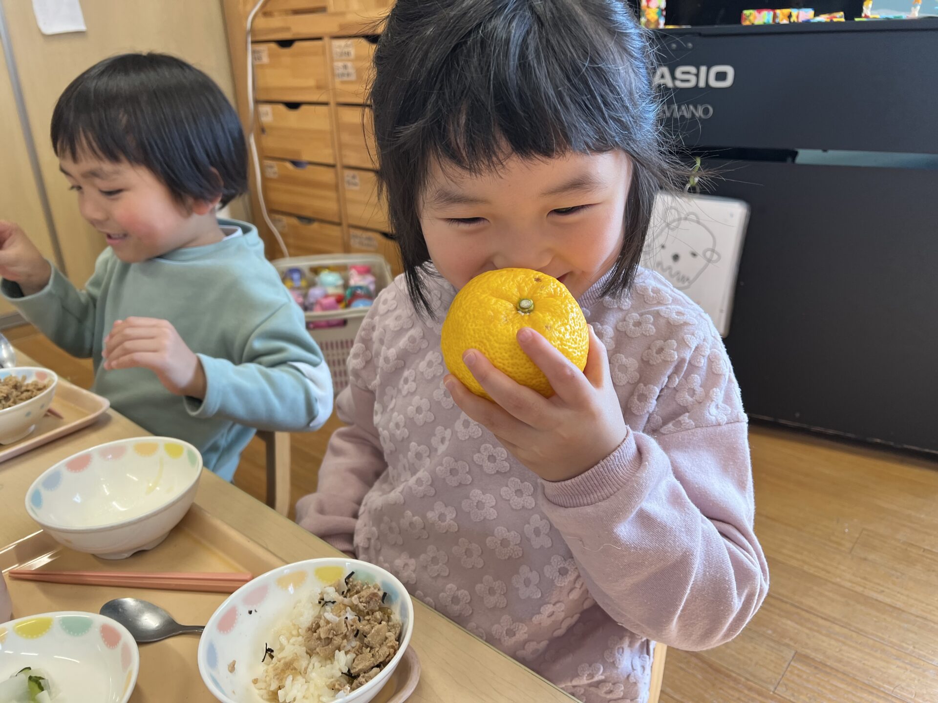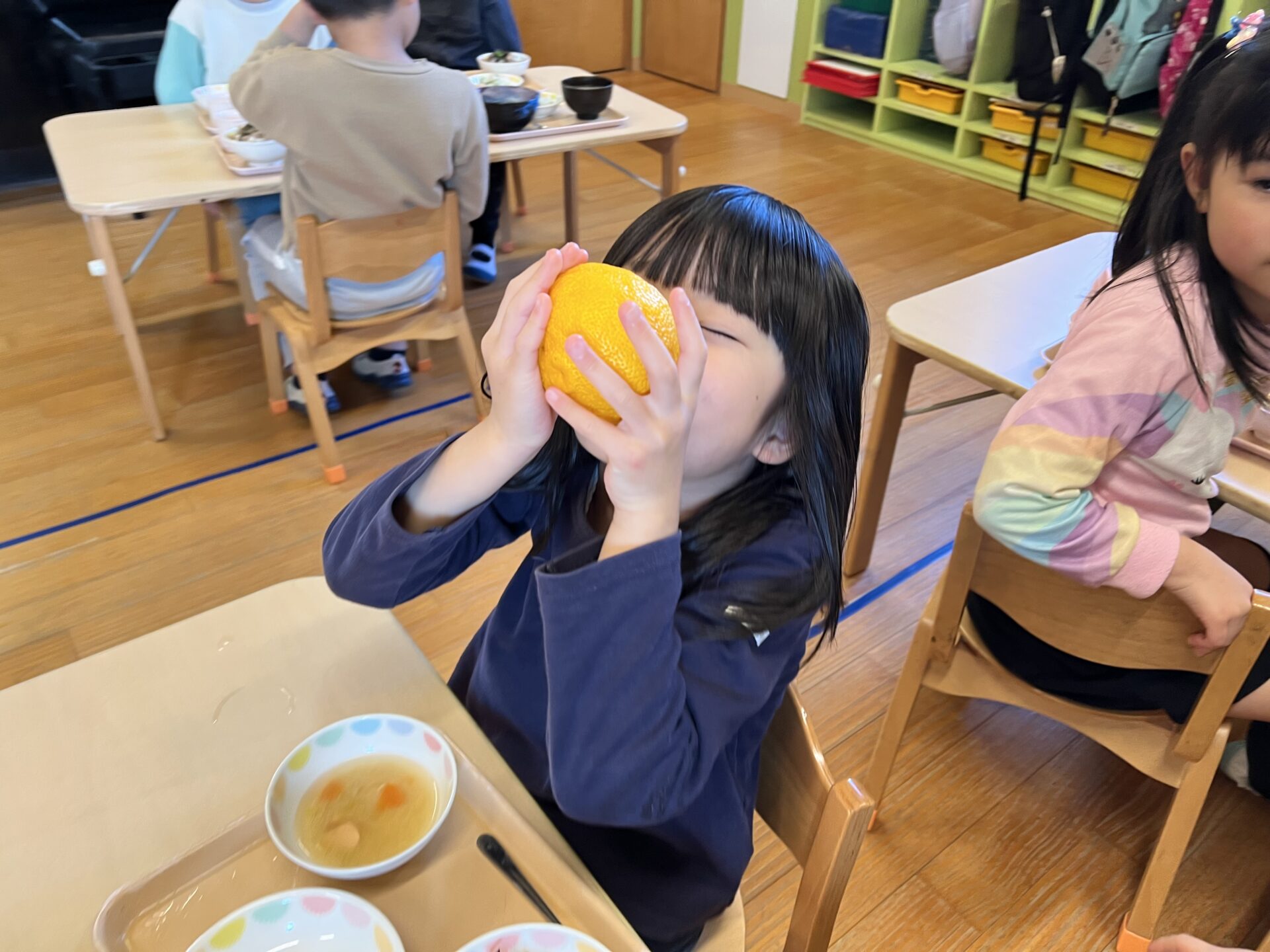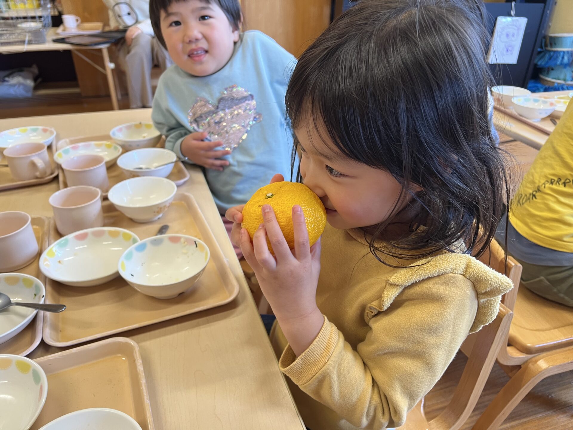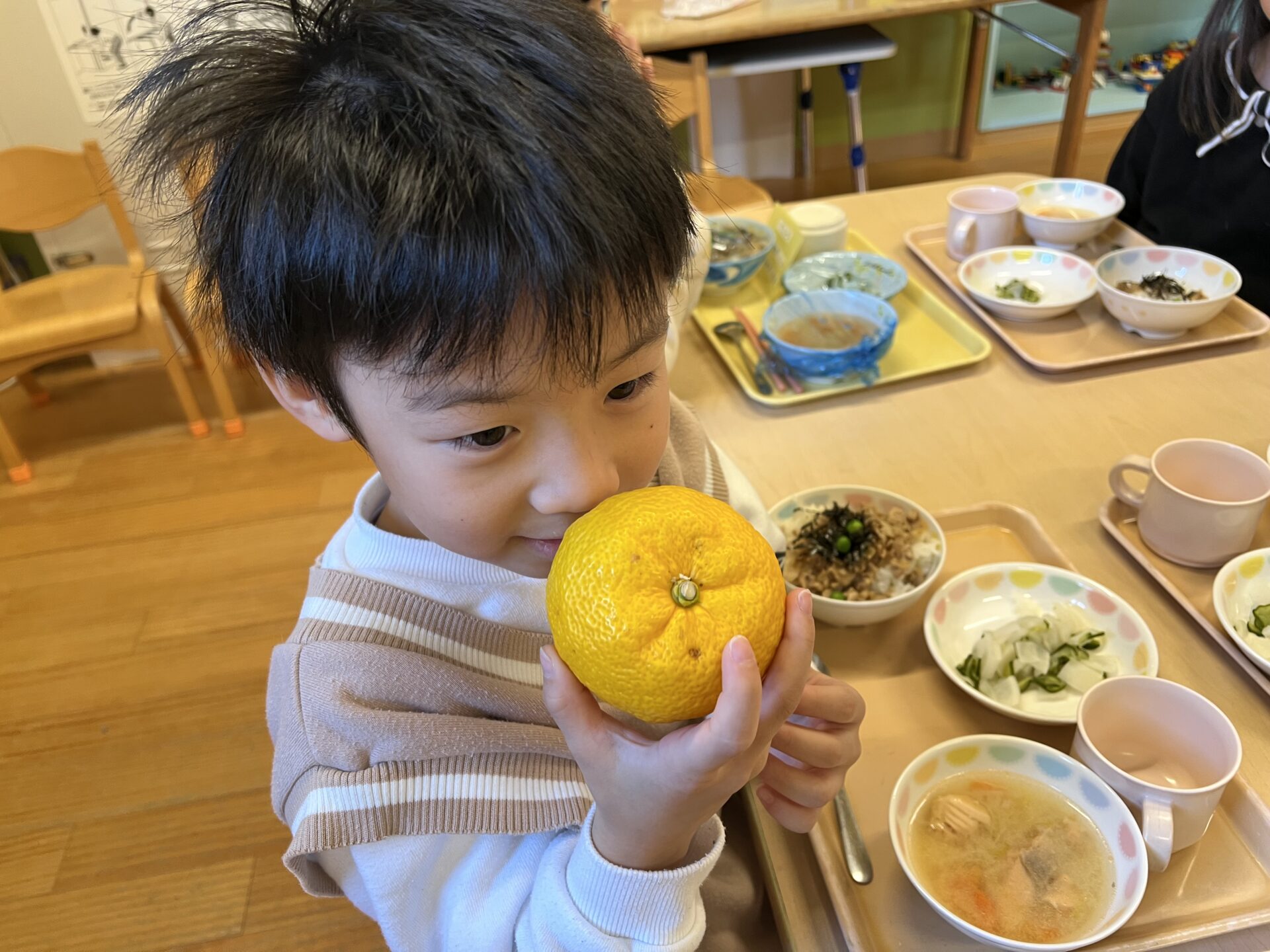 4歳児・そらチームさんにも、【ゆず】の匂いを匂ってもらいました😊Tちゃんは、降園時お母さんに『めっちゃいい匂いだった💗』と話していました。