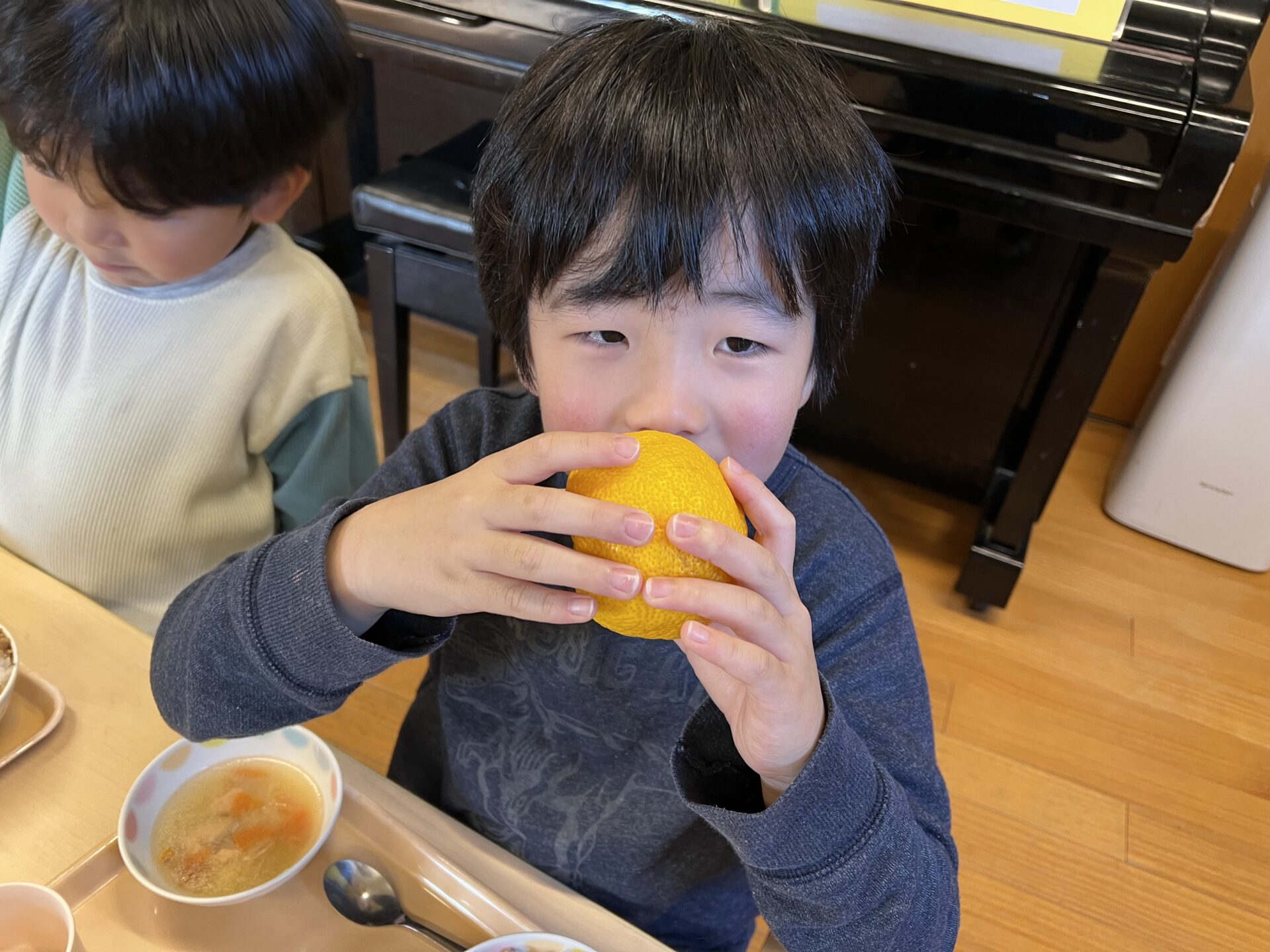5歳児・くじらチームのYくんは、ゆずの香りが気に入ったようで、ゆず湯に入ってみたくなったようです😊お母さんに、ゆず湯に入りたいとお願いしていました。