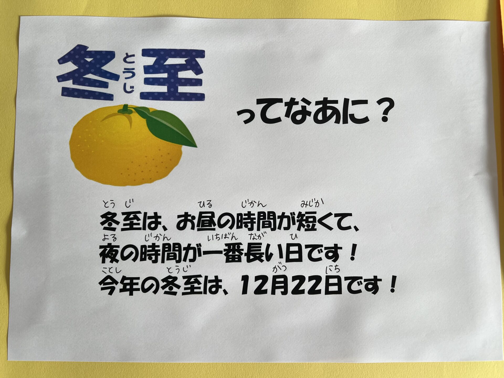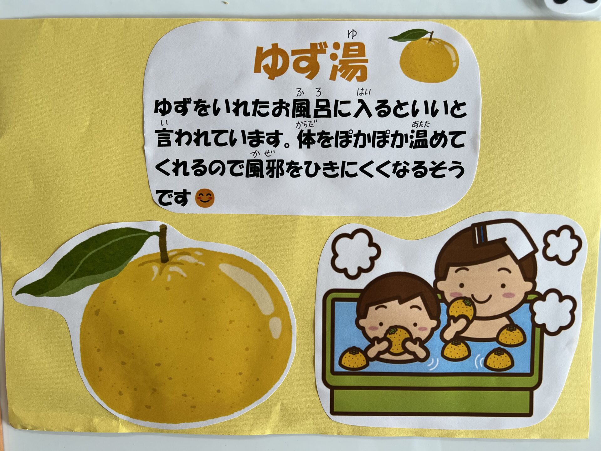 冬至の日に、【ゆず湯】に入るといいんだよ!と言うと、『お風呂屋さんで見たことある!』って言う子や『でも、お母さんがダメって言うかも💦』と果物をお風呂に入れるなんてと思ったようです😄