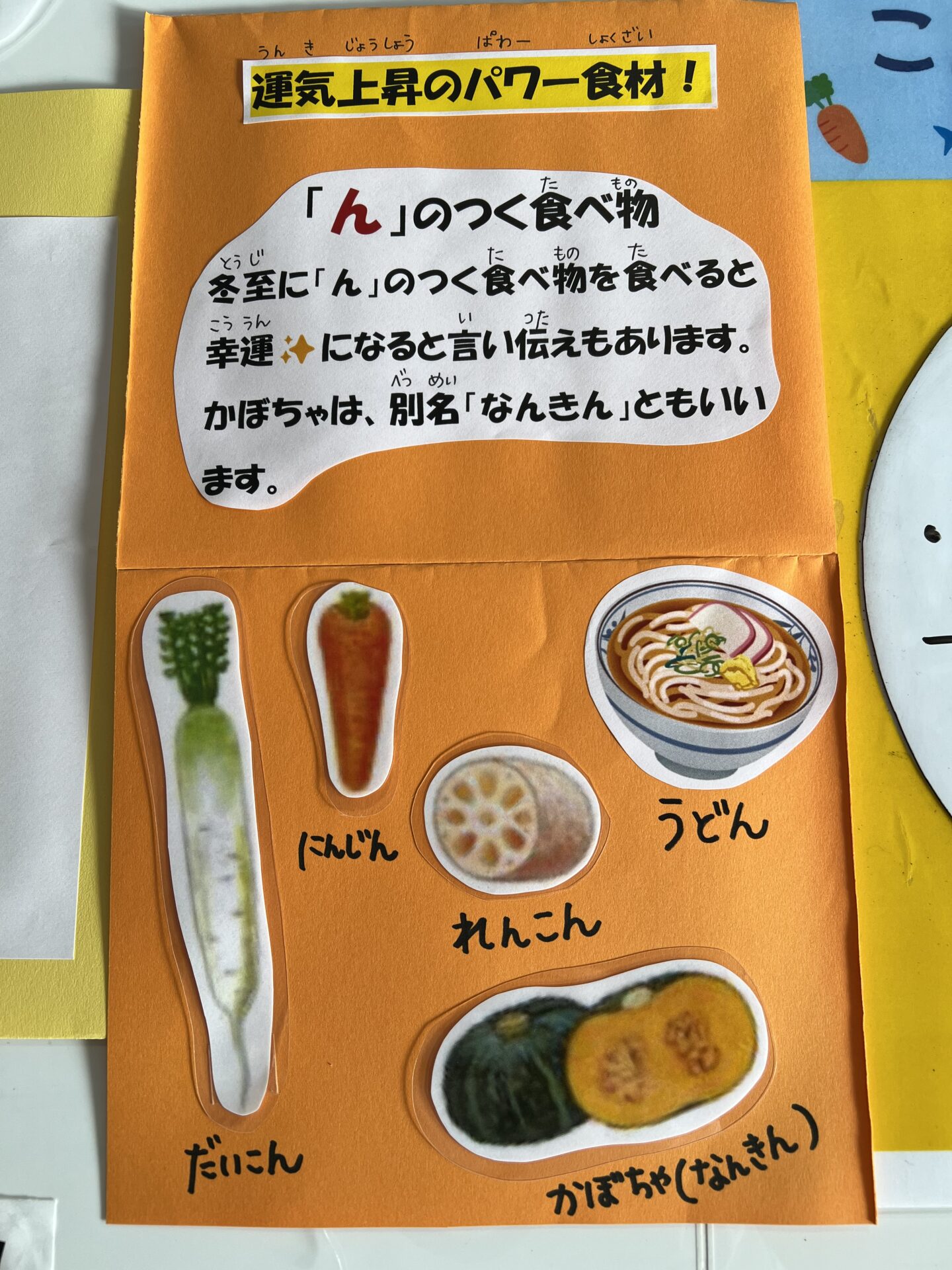 この他、冬至に『ん』のつく食材を食べると、運気上昇✨になるとも言われているよ!と話すと、石狩汁に入っている「にんじん」を見つけたり「ごはん」も?と、『ん』のつく食材探しが始まりました😊