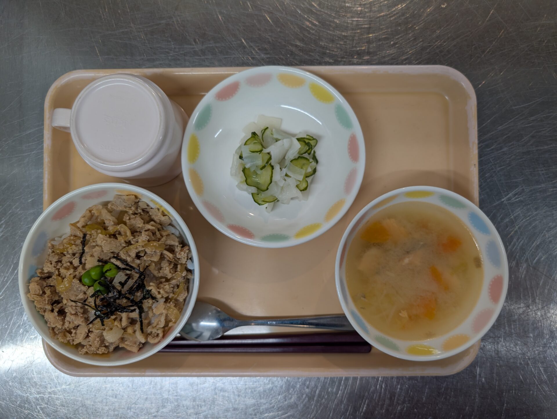 メニューは、豚丼、かぶの即席漬け、石狩汁です😊寒い時期にぴったりな石狩汁。さけがたくさん入っていたので、北海道を感じる一品でした。