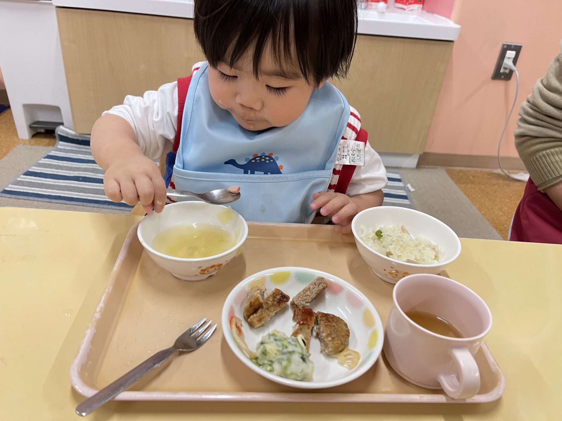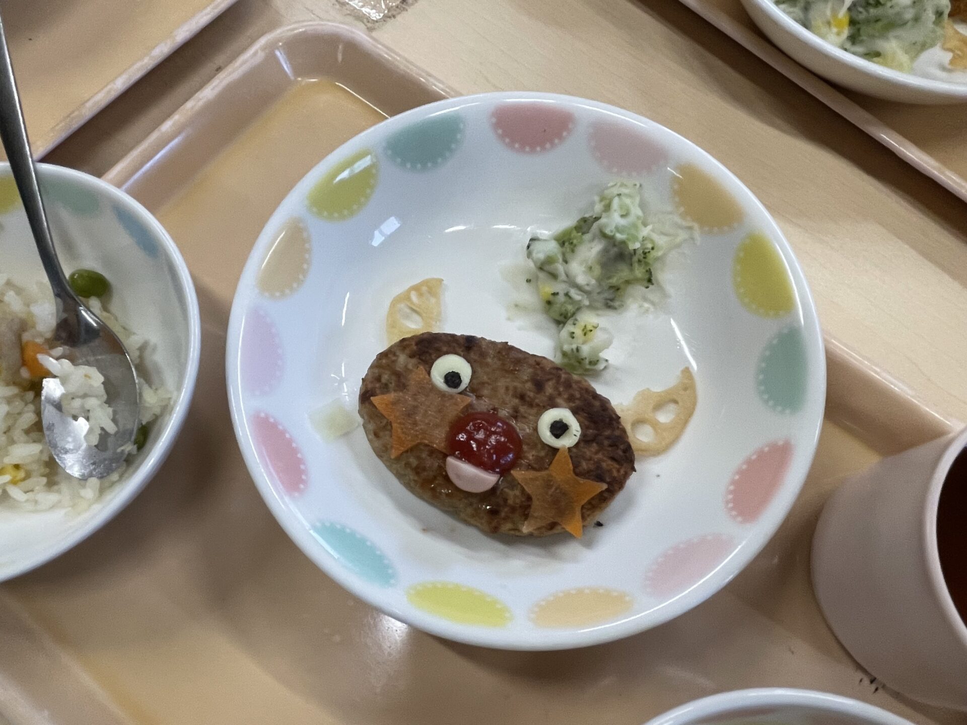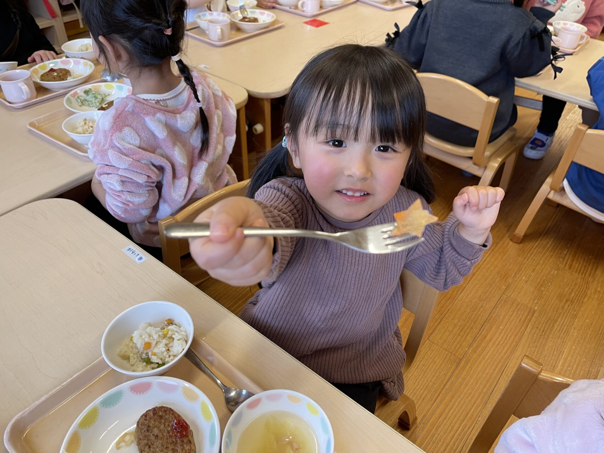 お星さまスープとは?幼児チームさんは、スープを配膳したあと、人参のトッピング🌟こまかい給食先生たちの演出に脱帽です✨早速、3歳児・にじチームさんたちは、スープの中のお星さまを見つけていました。
