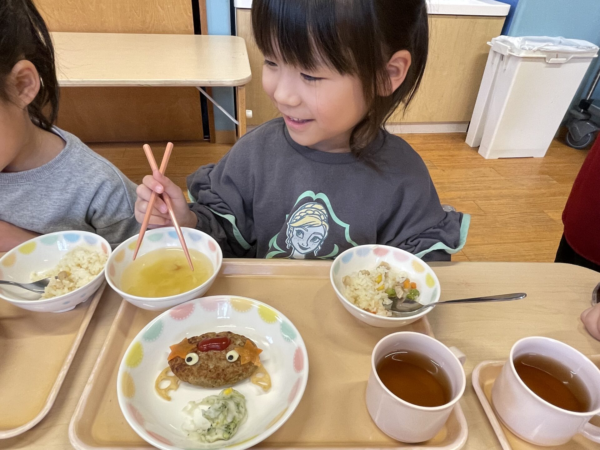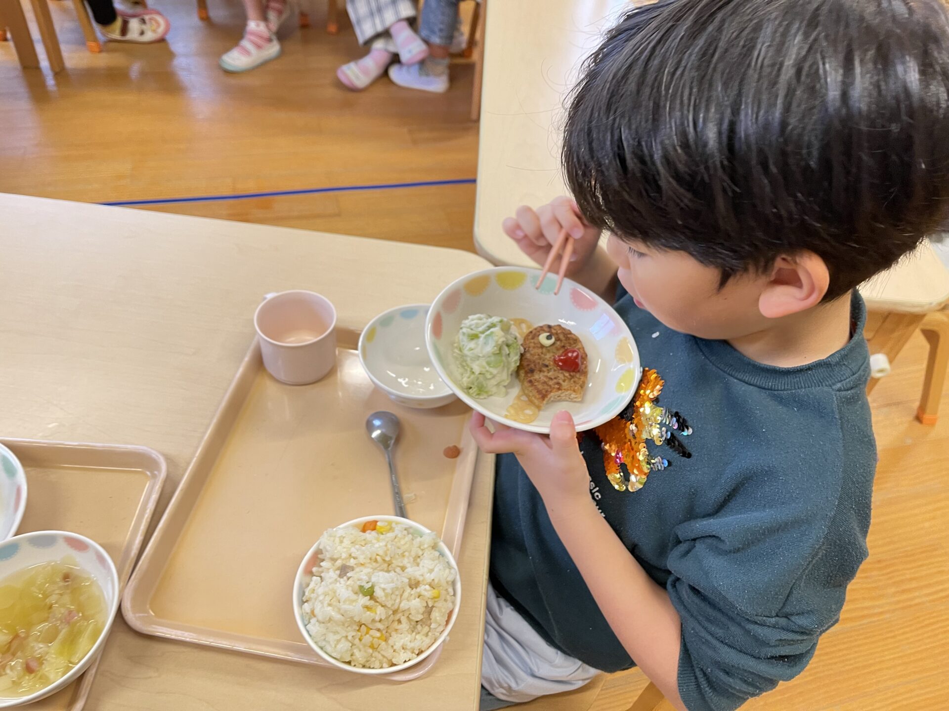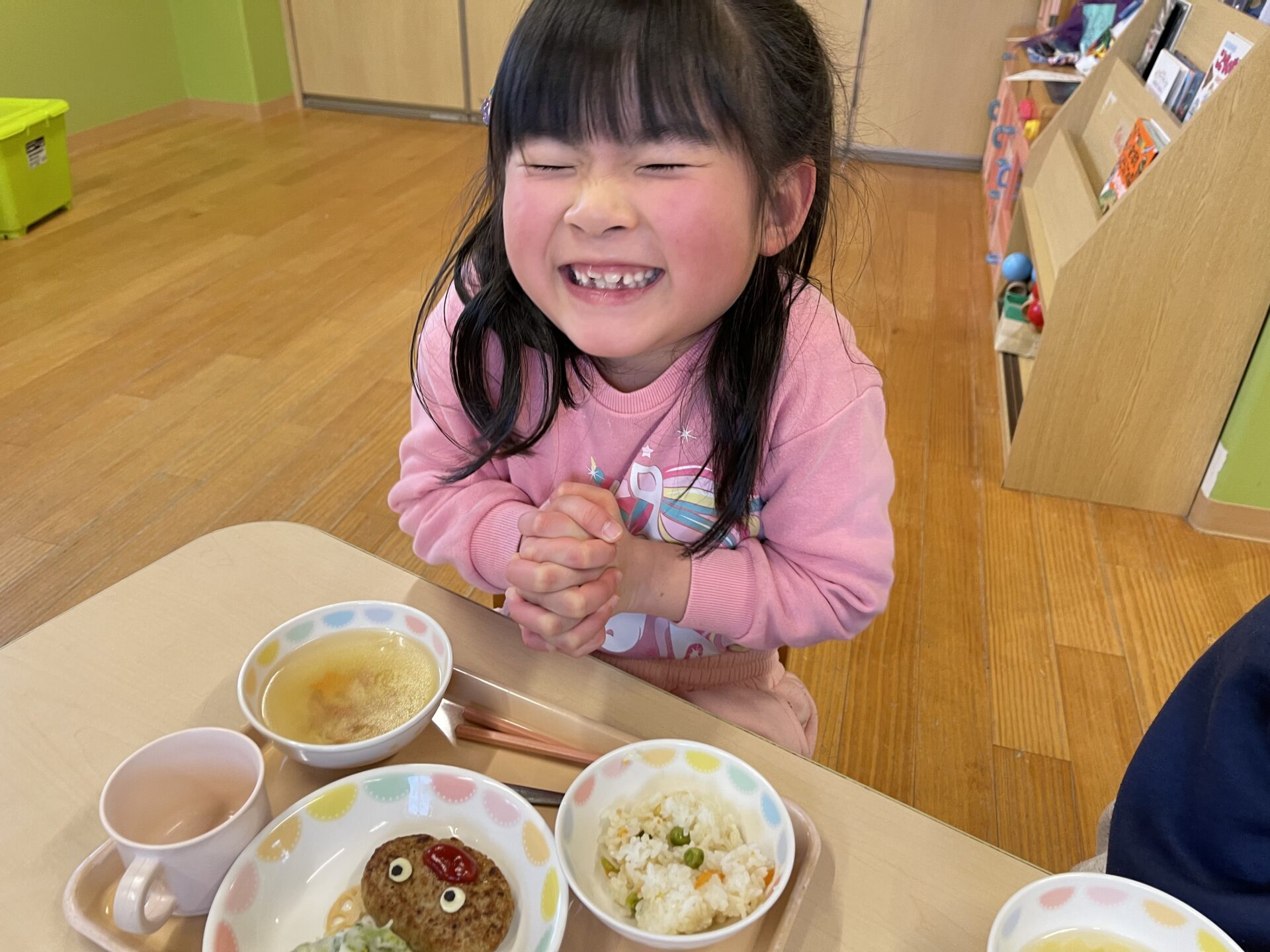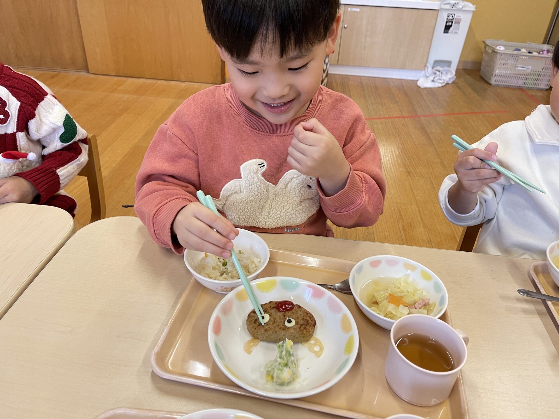 クリスマス誕生会だったので、先生たちもクリスマスのカチューシャなどを着けて、楽しんでいました♪私が、トナカイのメガネとカチューシャを身に着けていたので、可愛いトナカイハンバーグを食べるにじチームさんに、ちょっぴりいたずら(笑)