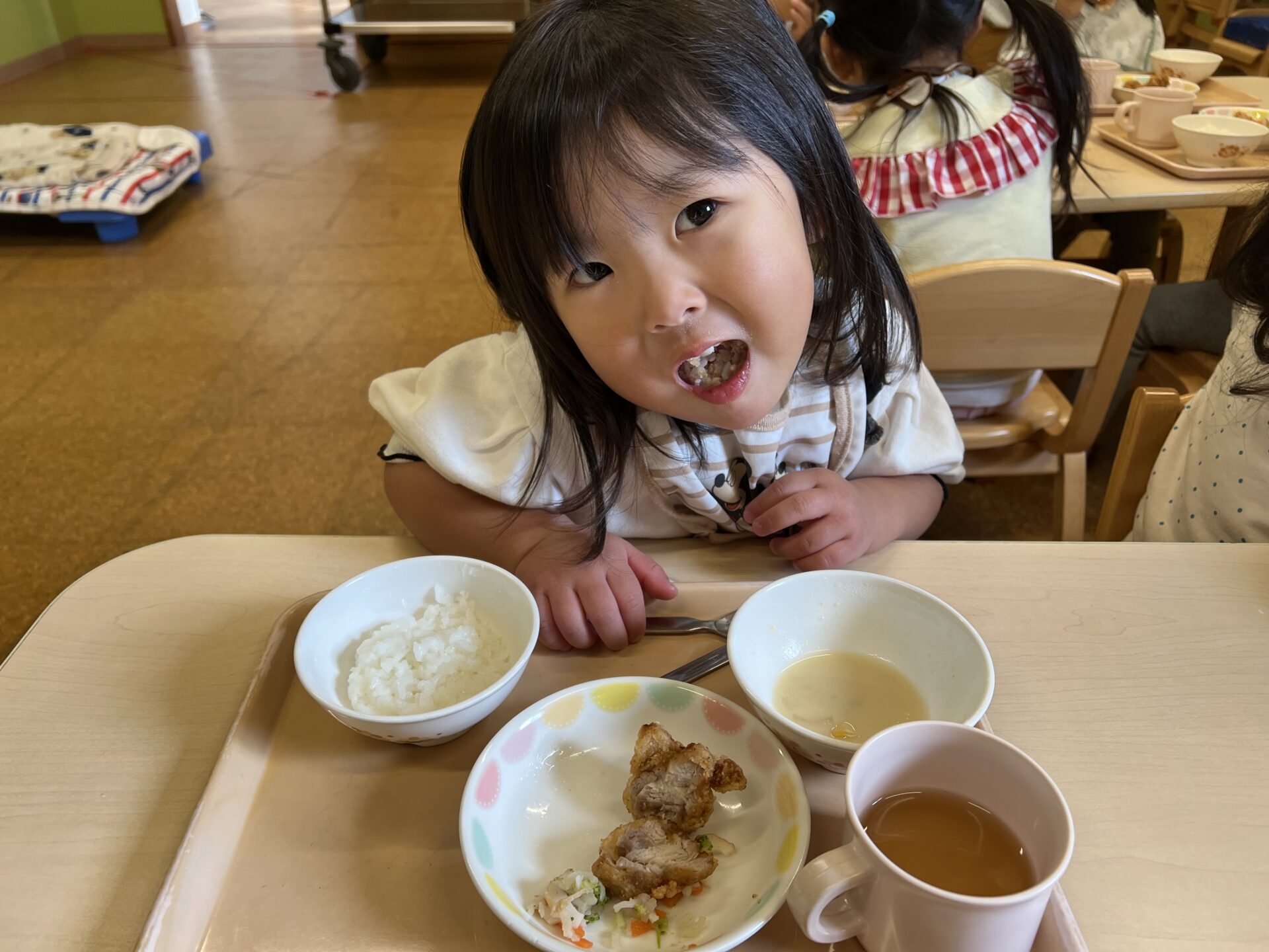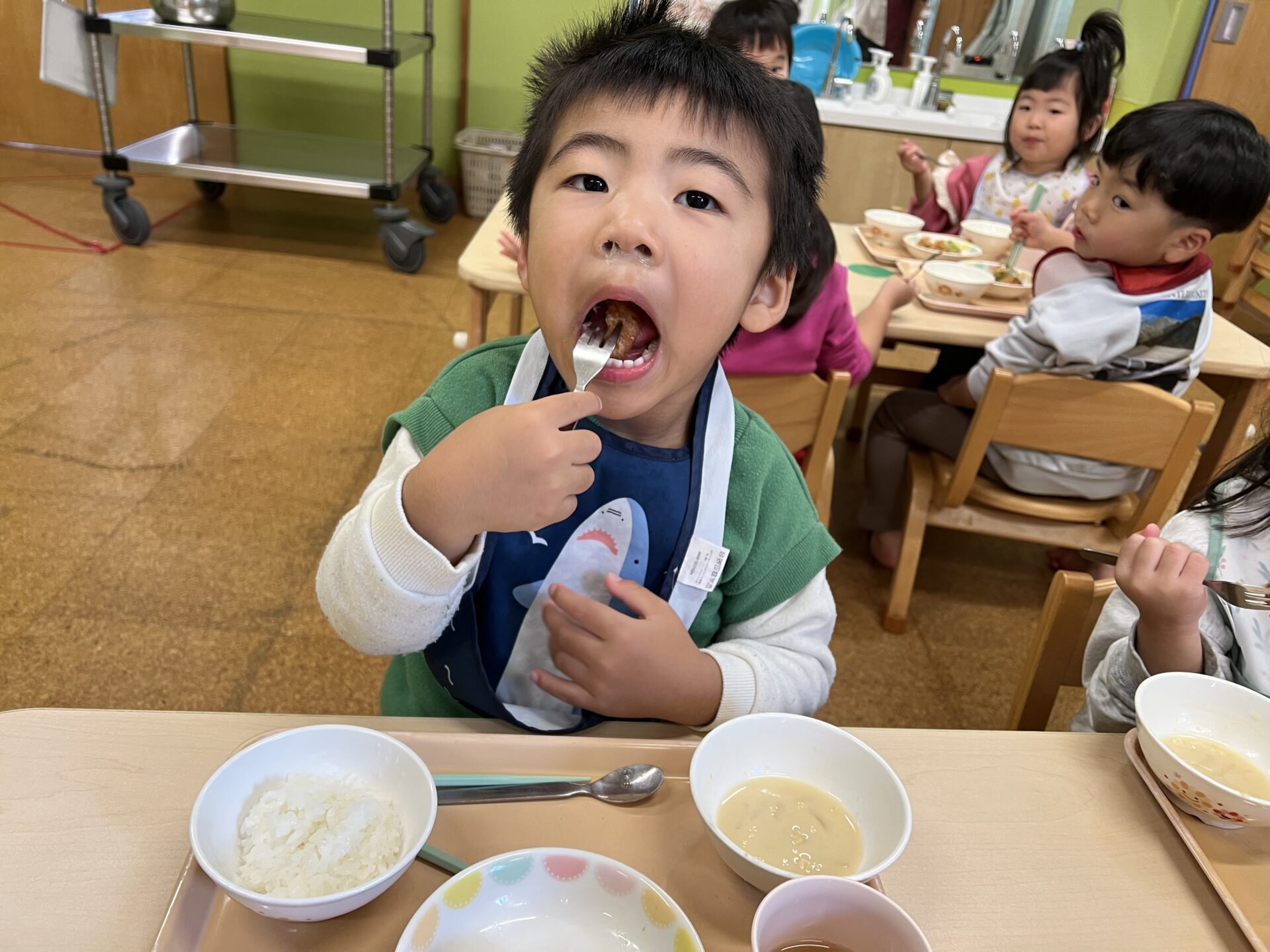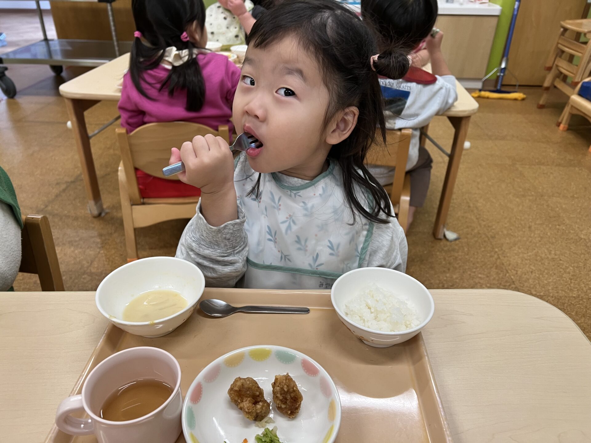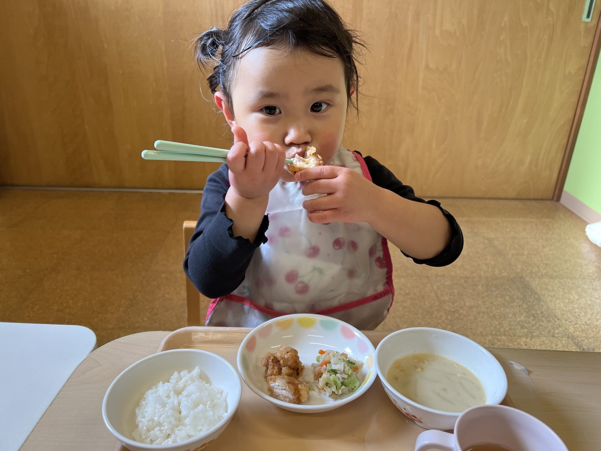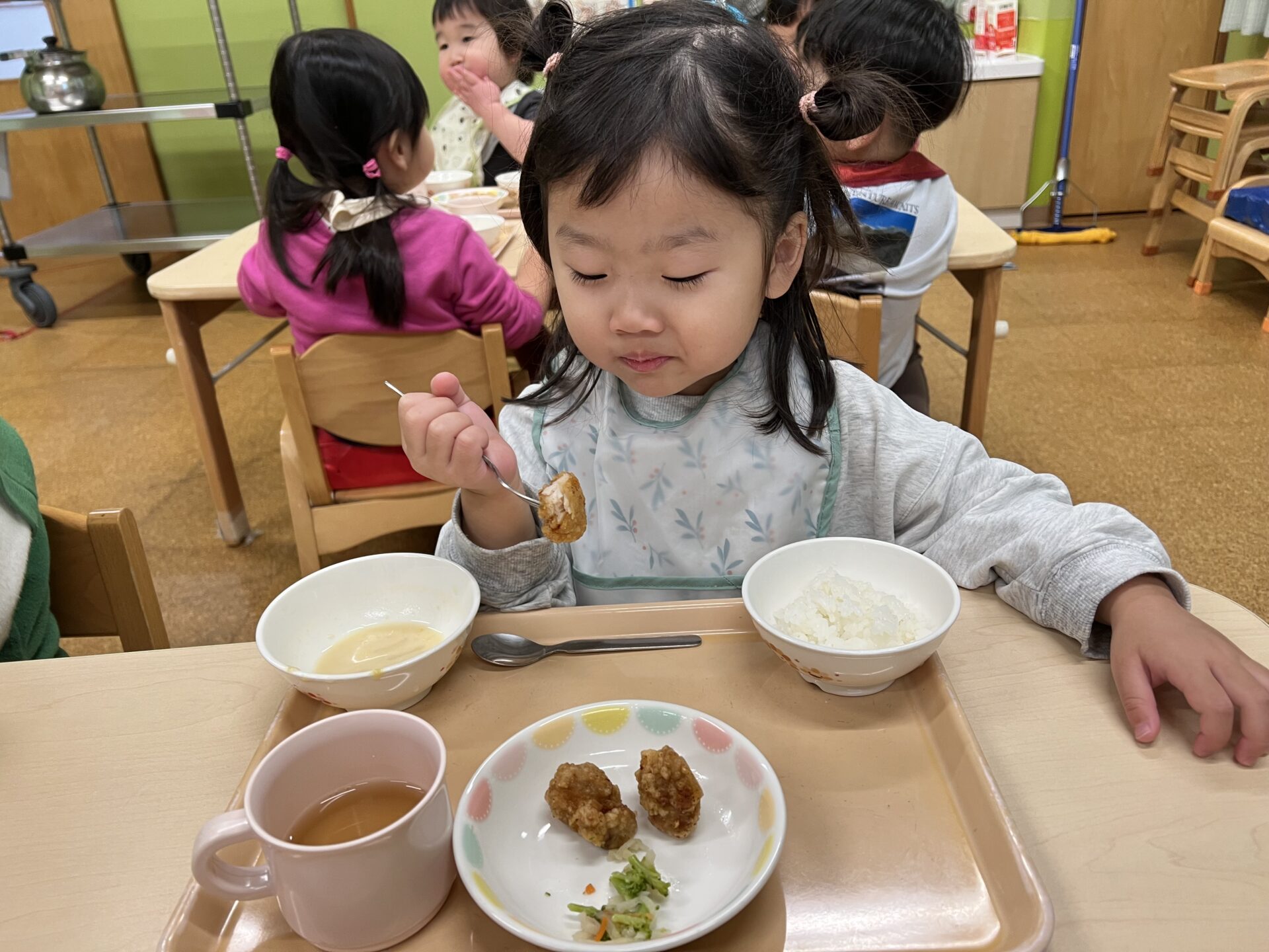 2歳児・あめチームのUちゃんは、ちょっぴり苦手なものが多いのですが、今日のから揚げは、美味しかったようで、『せんせーみててよ!』とからげ揚げを食べる姿を見せてくれました😊