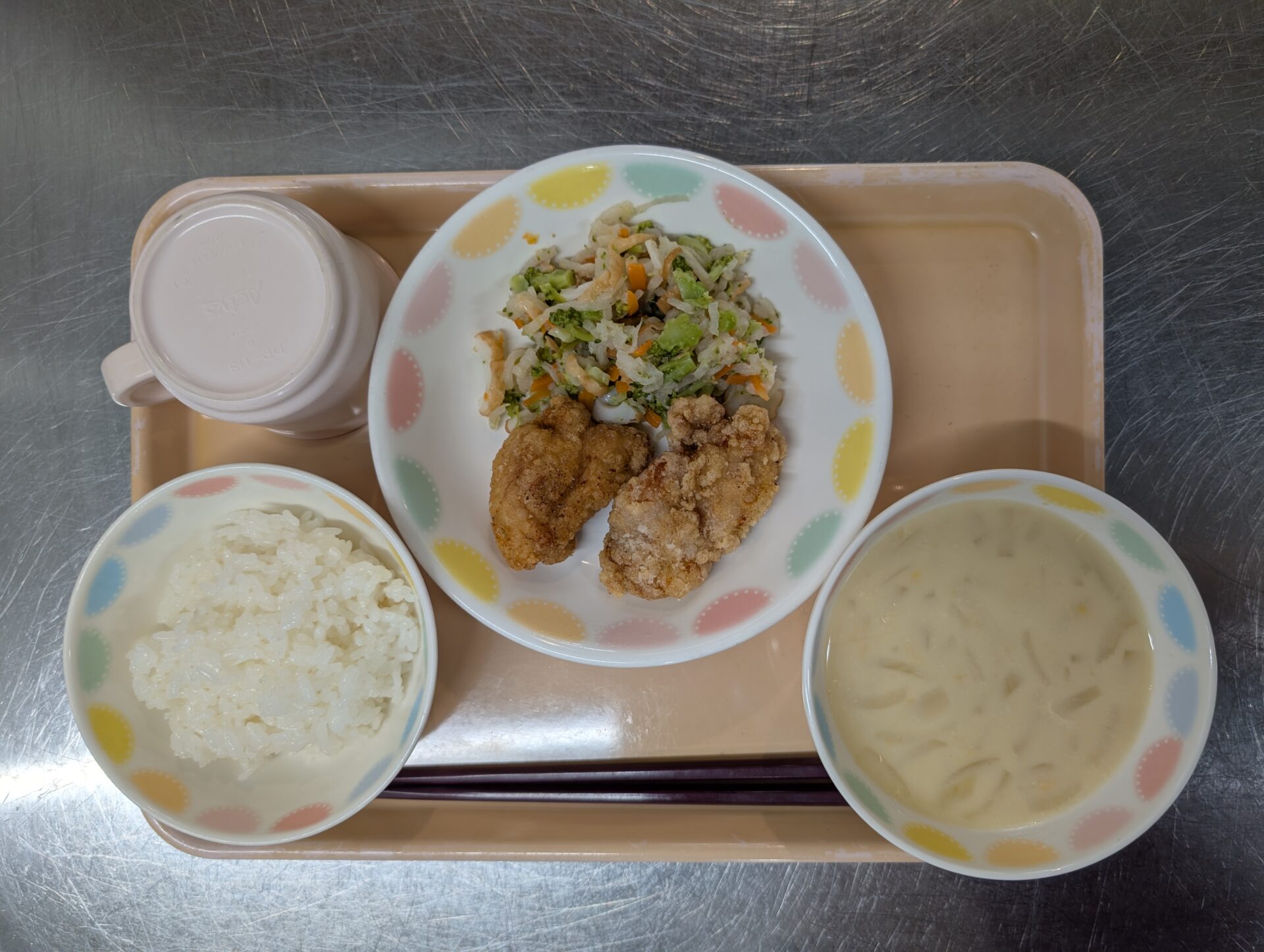 今日のメニューは、ご飯、鶏のから揚げ、大根とブロッコリーのサラダ、コーンスープです😊