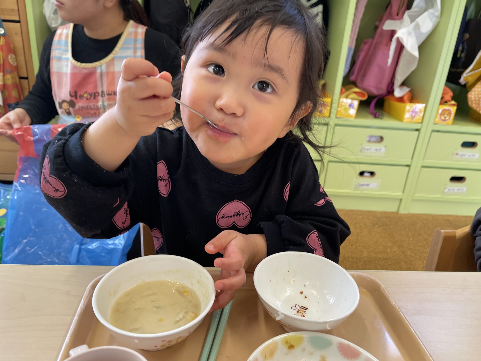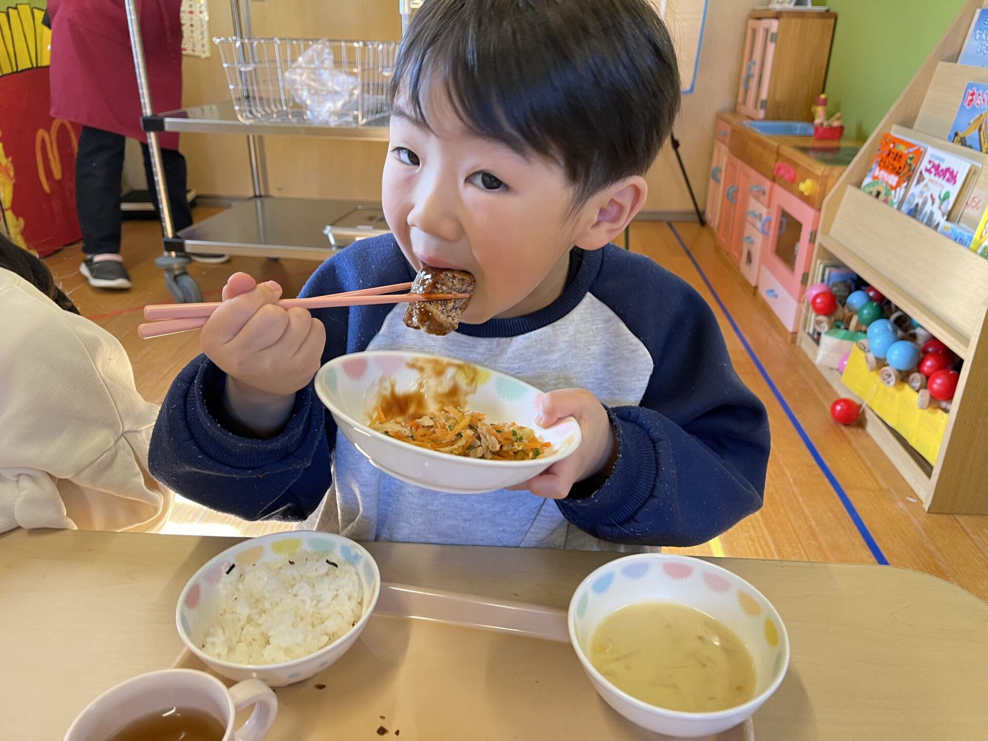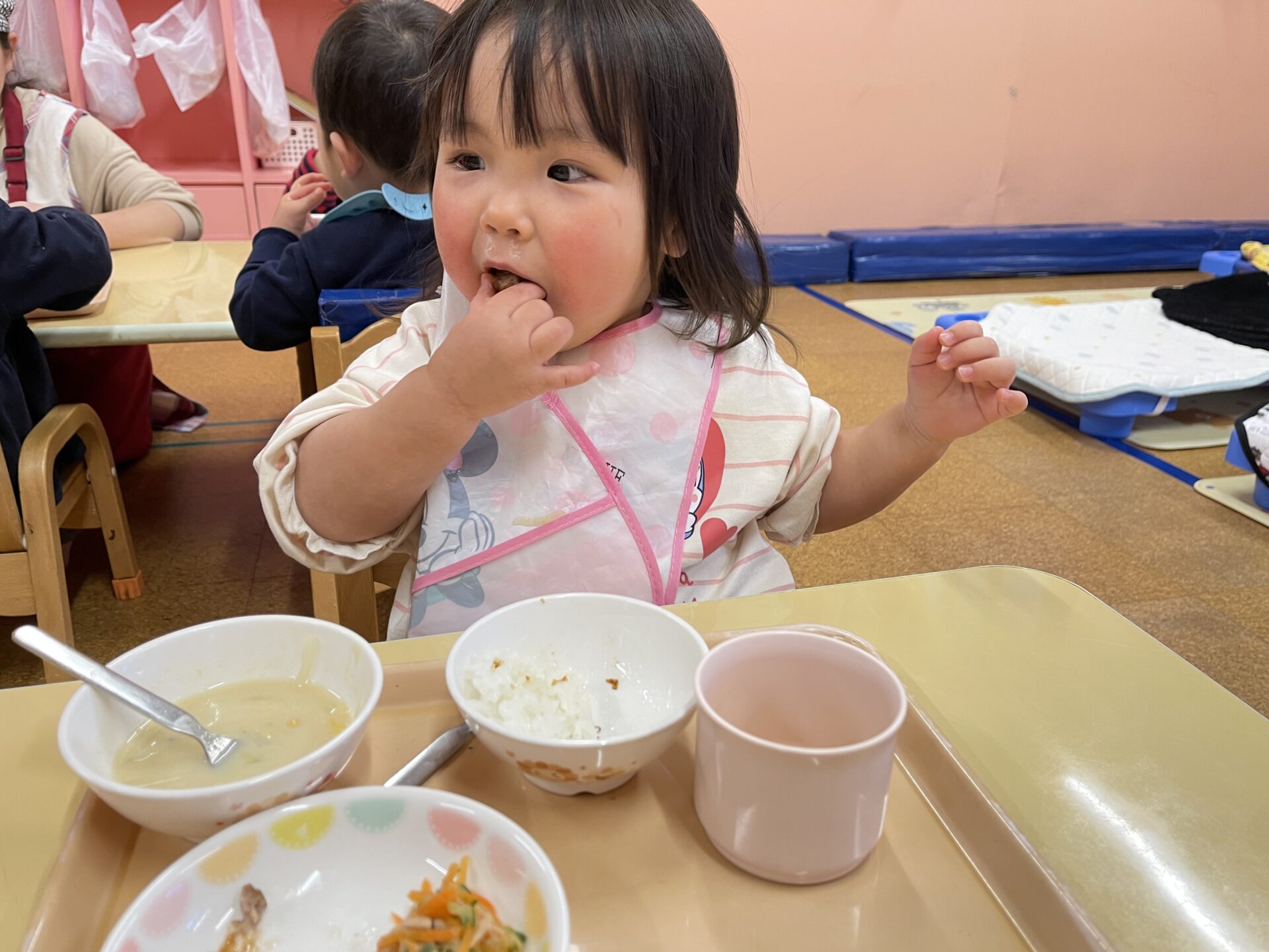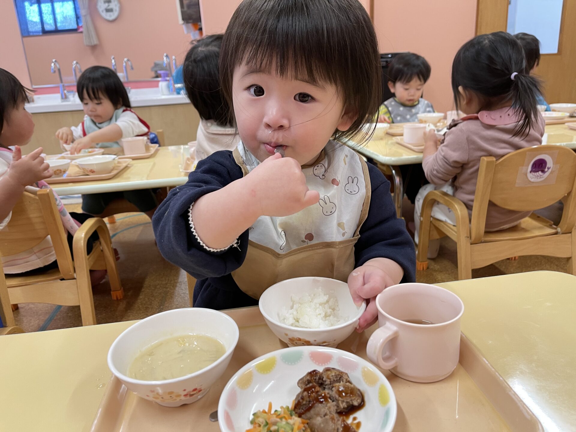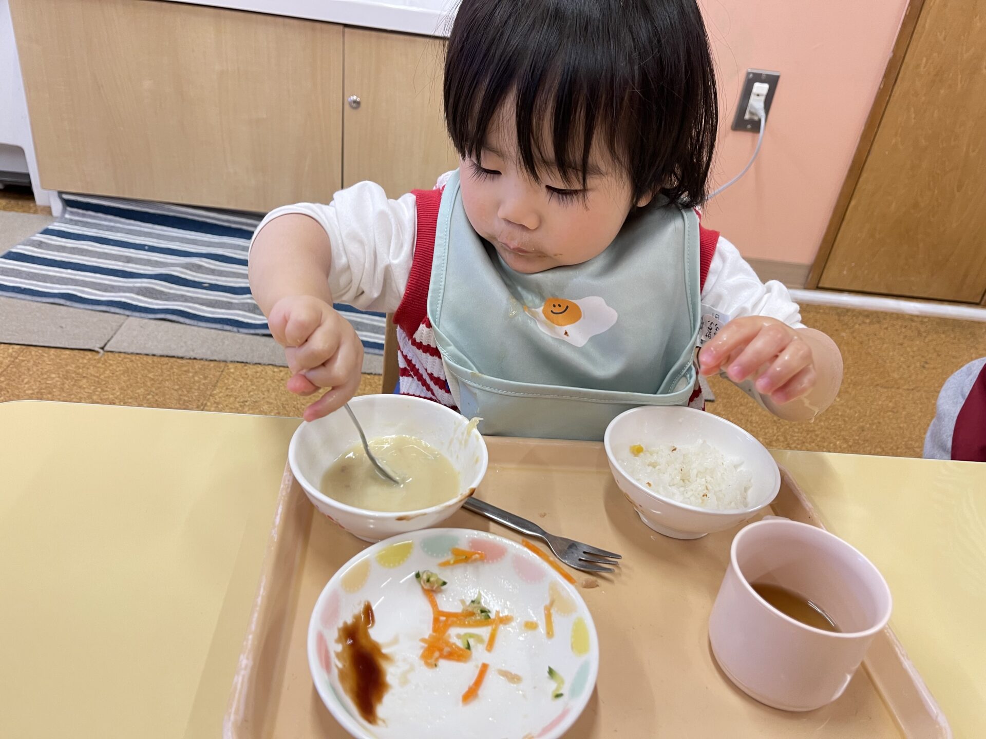 1歳児・だいちチームのFくんも、あっという間にハンバーグをぺろりと完食していましたよ😊