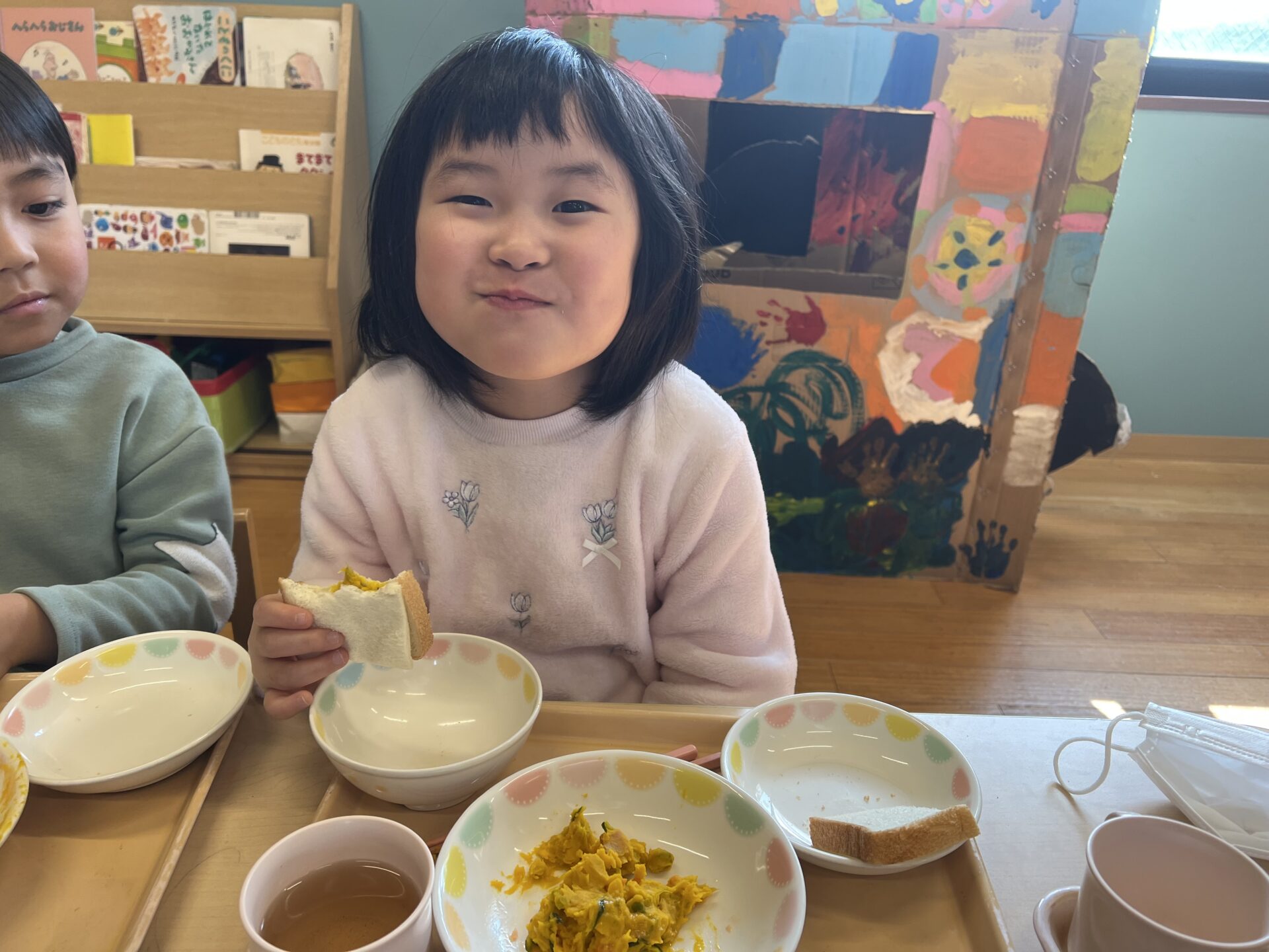子ども達は、アレンジレシピが得意✨食パンにかぼちゃサラダをはさんで、サンドイッチにしていました。