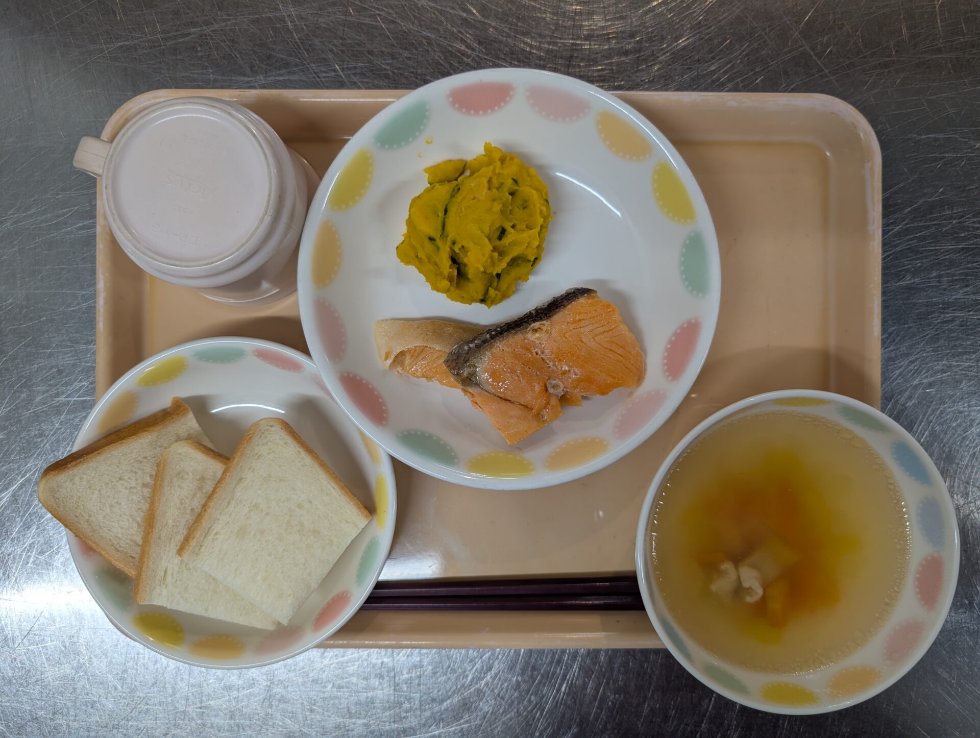 今日のメニューは、食パン、鮭のさっぱりレモン焼き、かぼちゃサラダ、セロリスープです😊