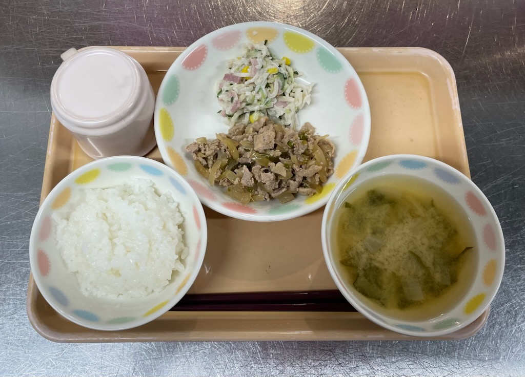 今日のメニューは、ご飯、豚の生姜焼き、切干大根のサラダ、さつま芋の味噌汁です😊
