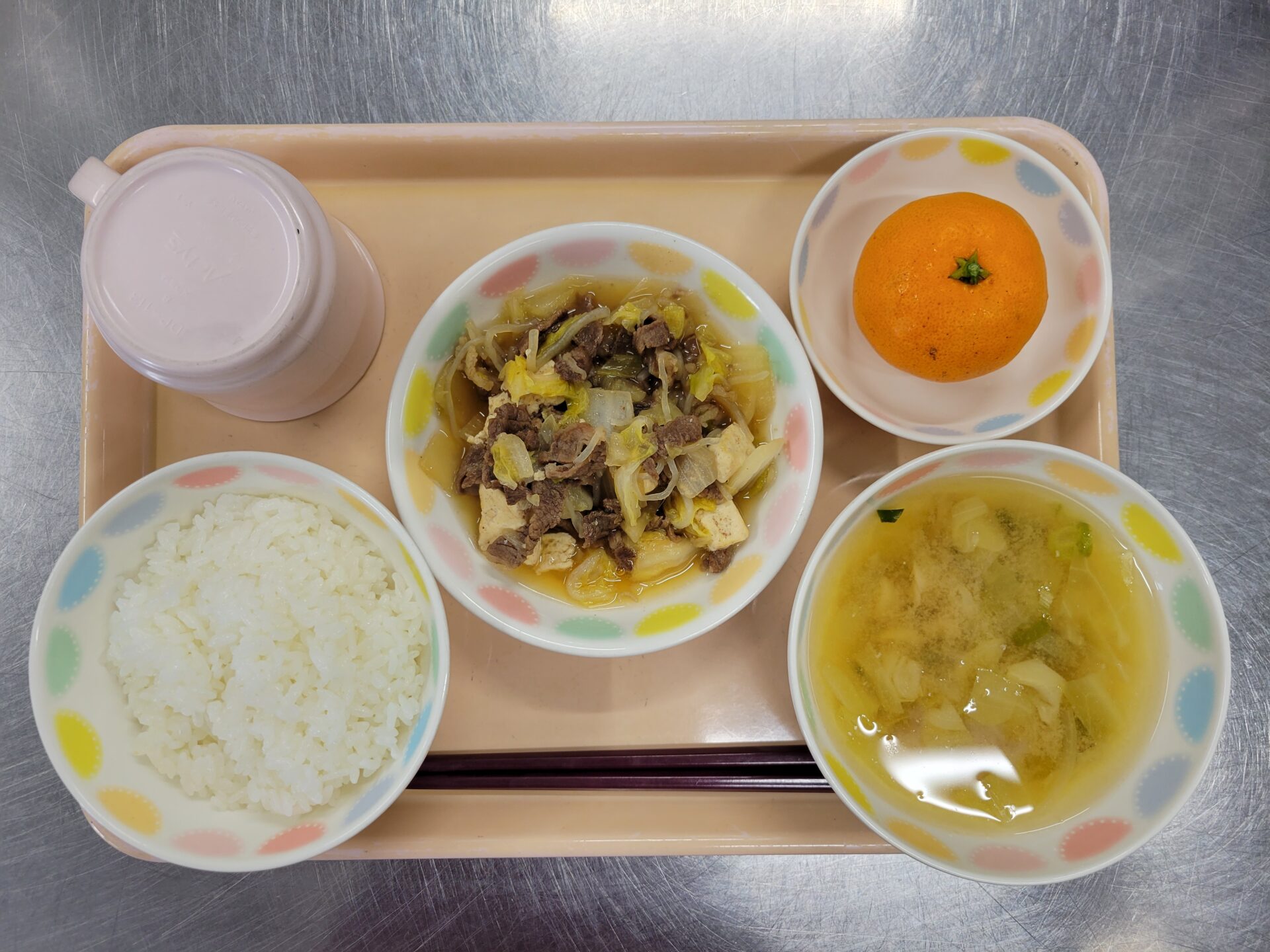 ごはん。みそ汁。すき焼風煮。みかん。
