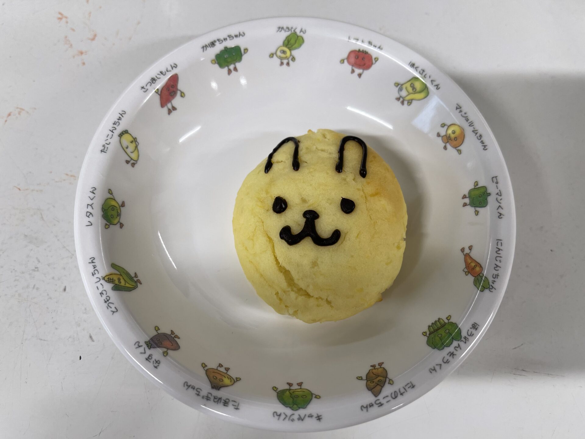おやつ…こちらもお月見おやつ!スイートポテトにかわいいうさぎが描かれていました。配られると「うさぎだぁ~♡」「かわいい♡」と、こどもたちは大喜びでした。