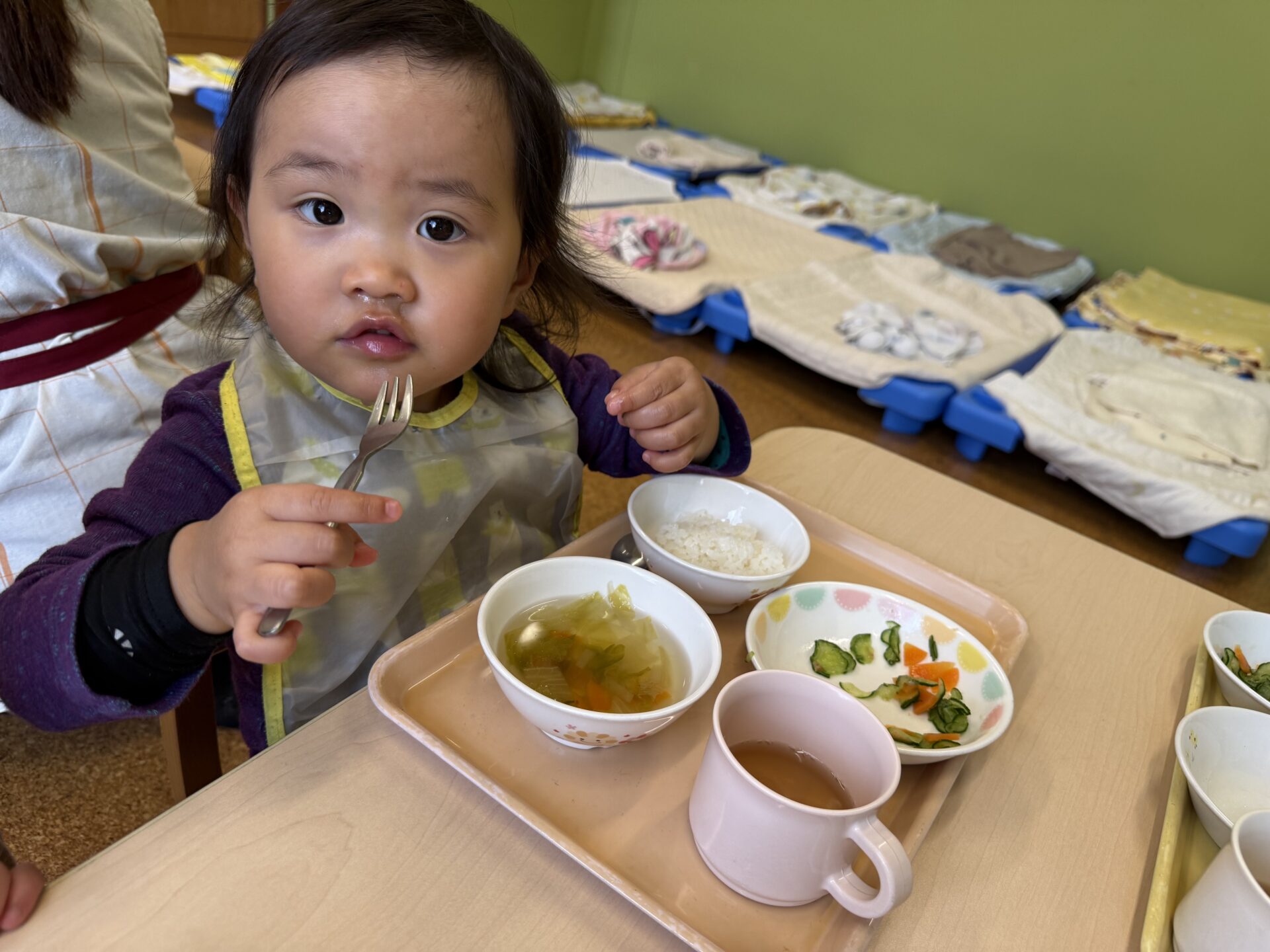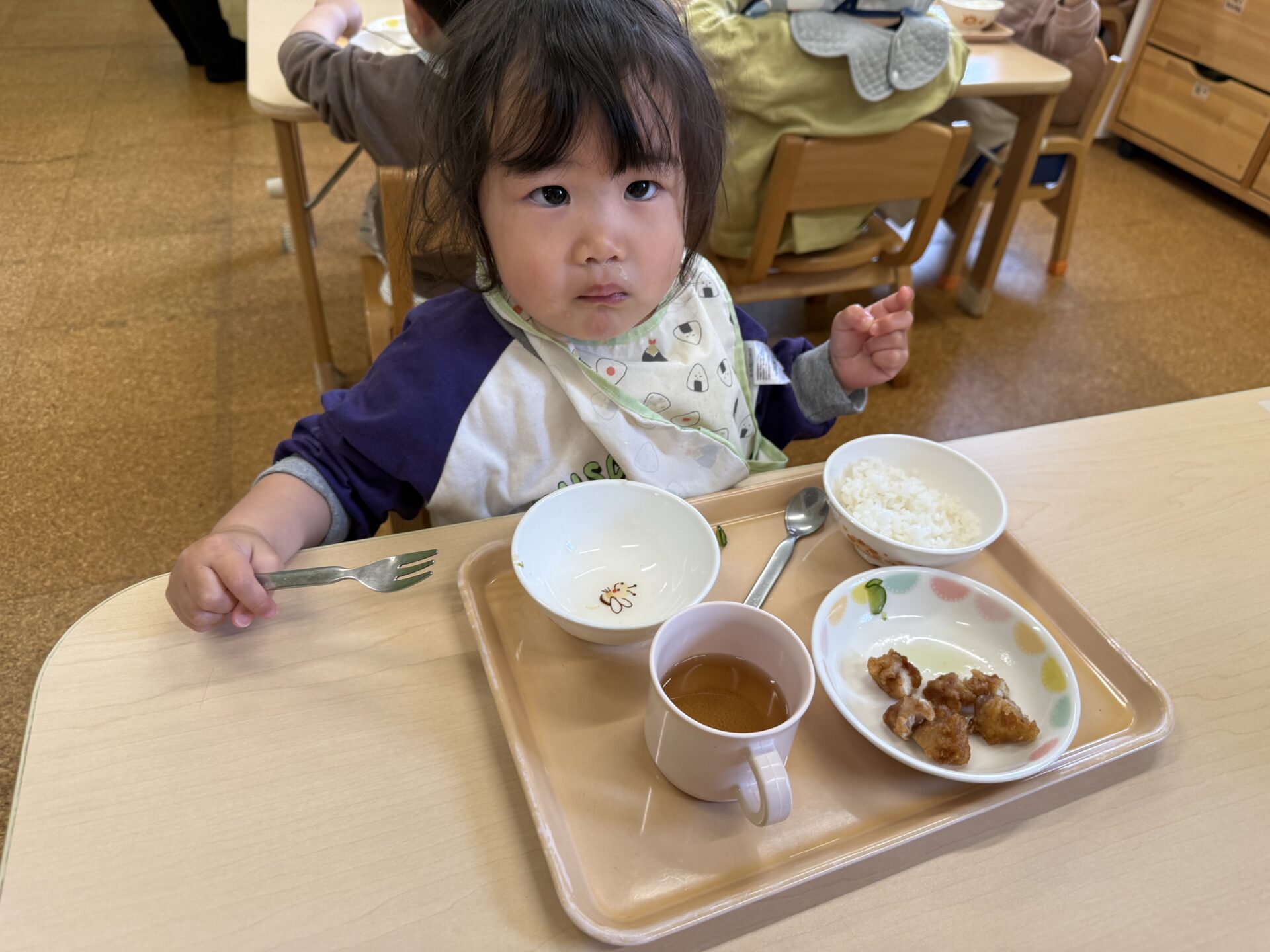 今日のおいしい顔は、2歳児・あめチーム。とってもやんちゃなクラスで…😁唯一、給食の時間だけは静かです。