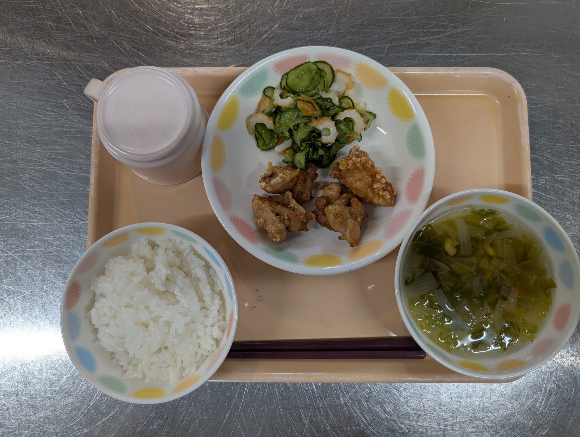 今日のメニューは、ご飯、鶏のから揚げ、きゅうりの中華サラダ、レタスのスープです😊