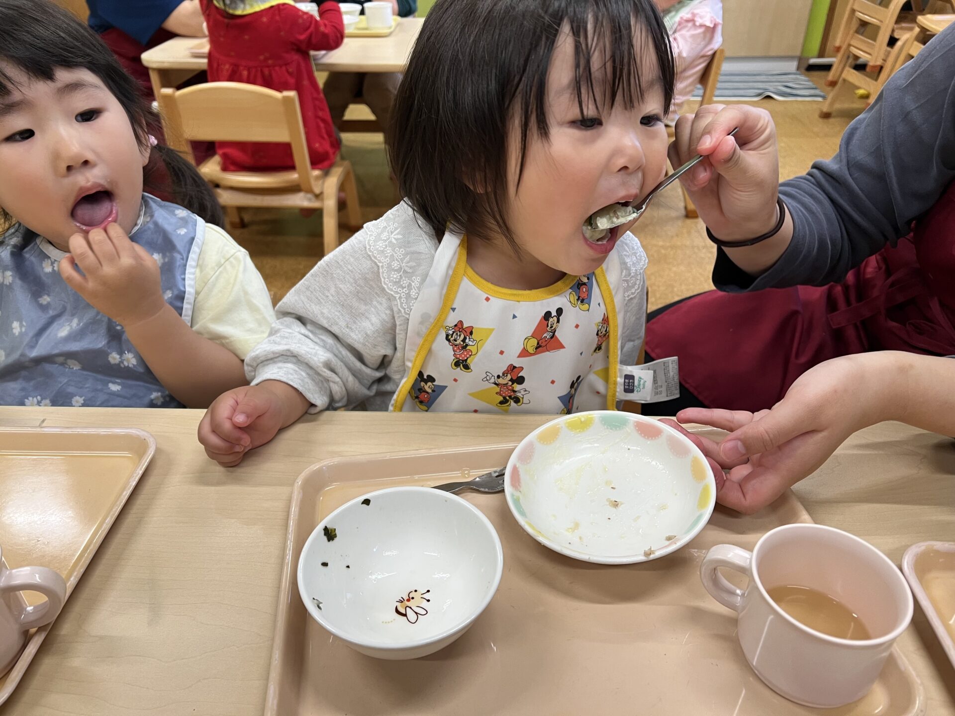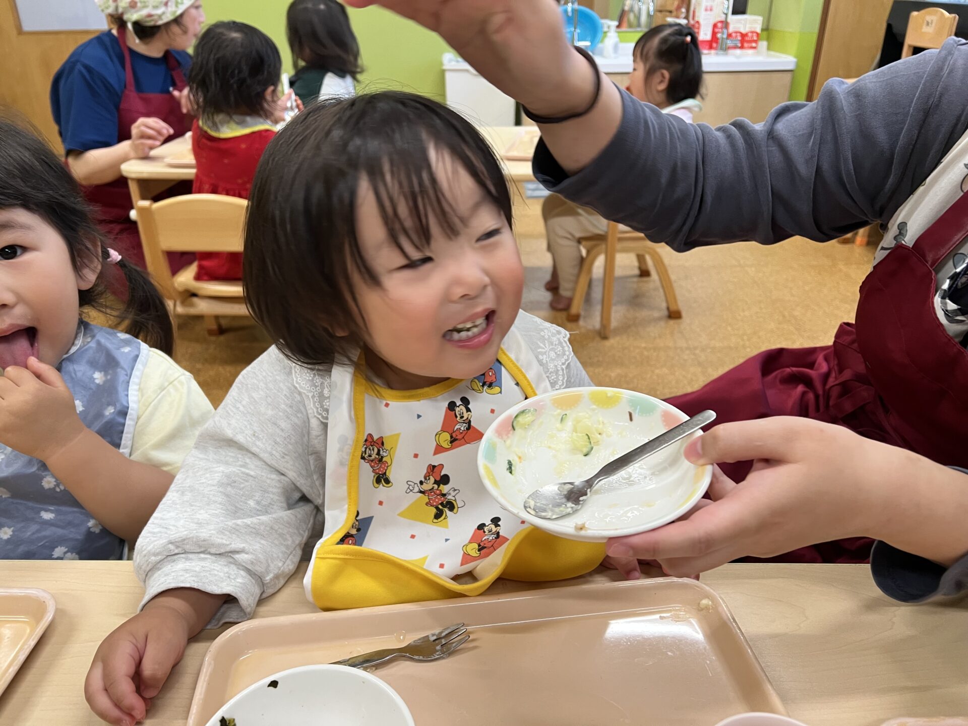 2歳児・あめチームさんに行ってみると、いつもはモリモリ食べているイメージのあめチームさんですが…今日は、なんだかみんな苦戦中💦