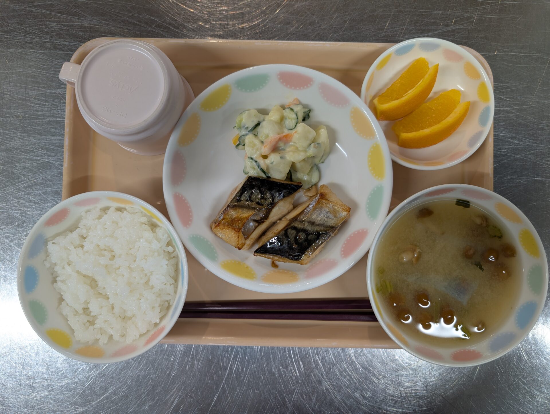 今日の給食は、ご飯、さばのしょうが煮、ポテトサラダ、なめこの味噌汁、オレンジです😊