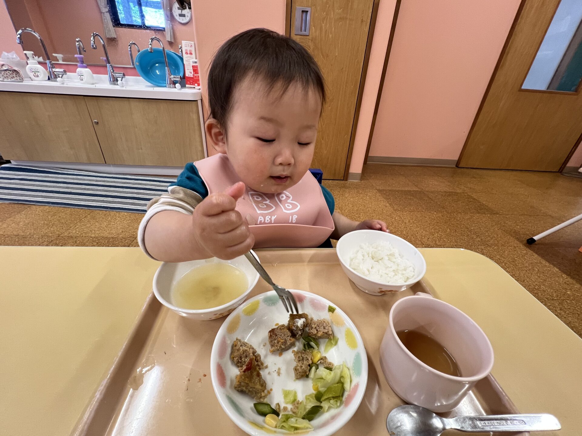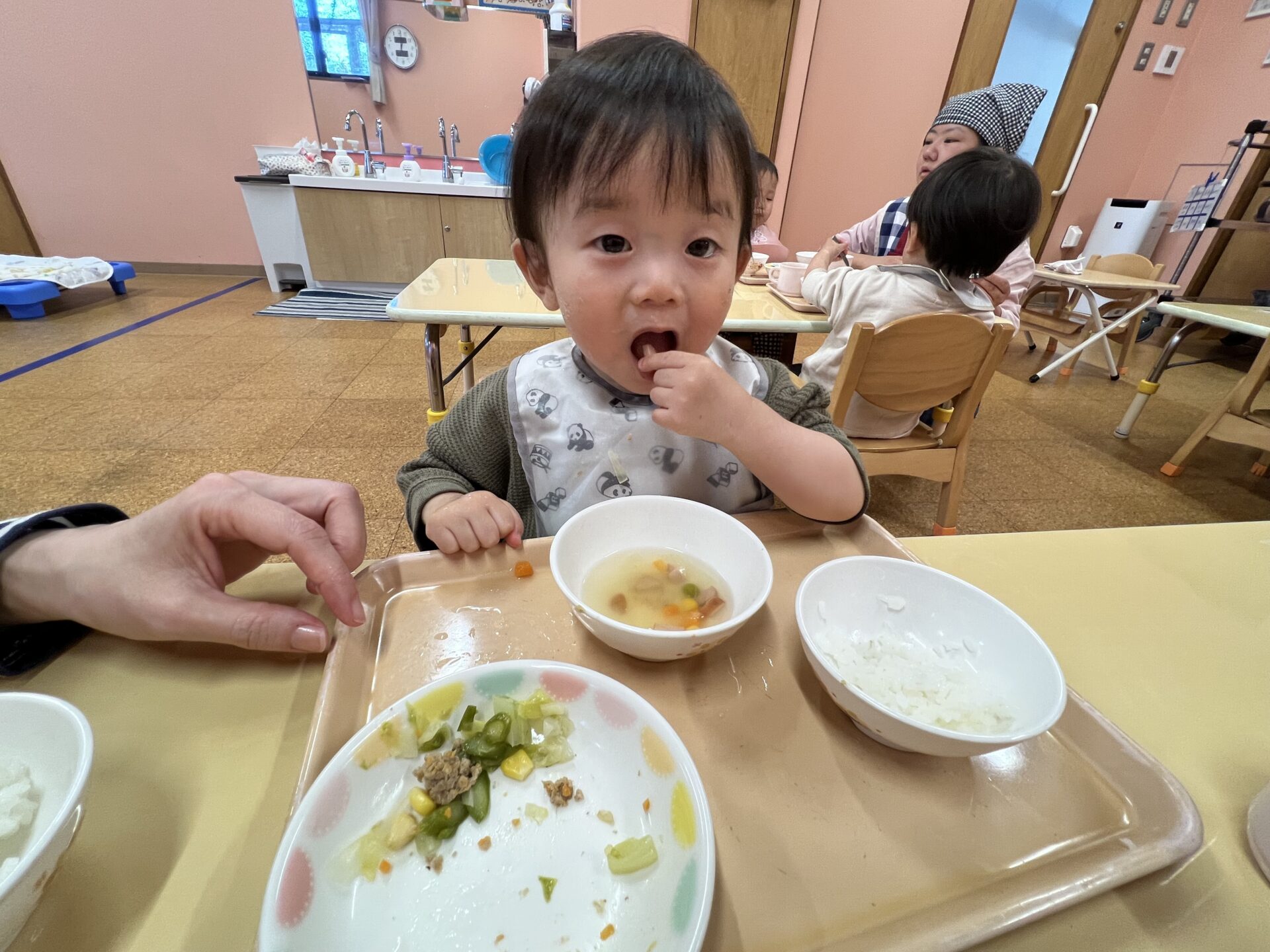 1歳児・だいちチームさんは、可愛い鯉のぼりミートローフを見せると大喜び😊食べやすいように、一口大の大きさにすると自分でパクパク食べていました。