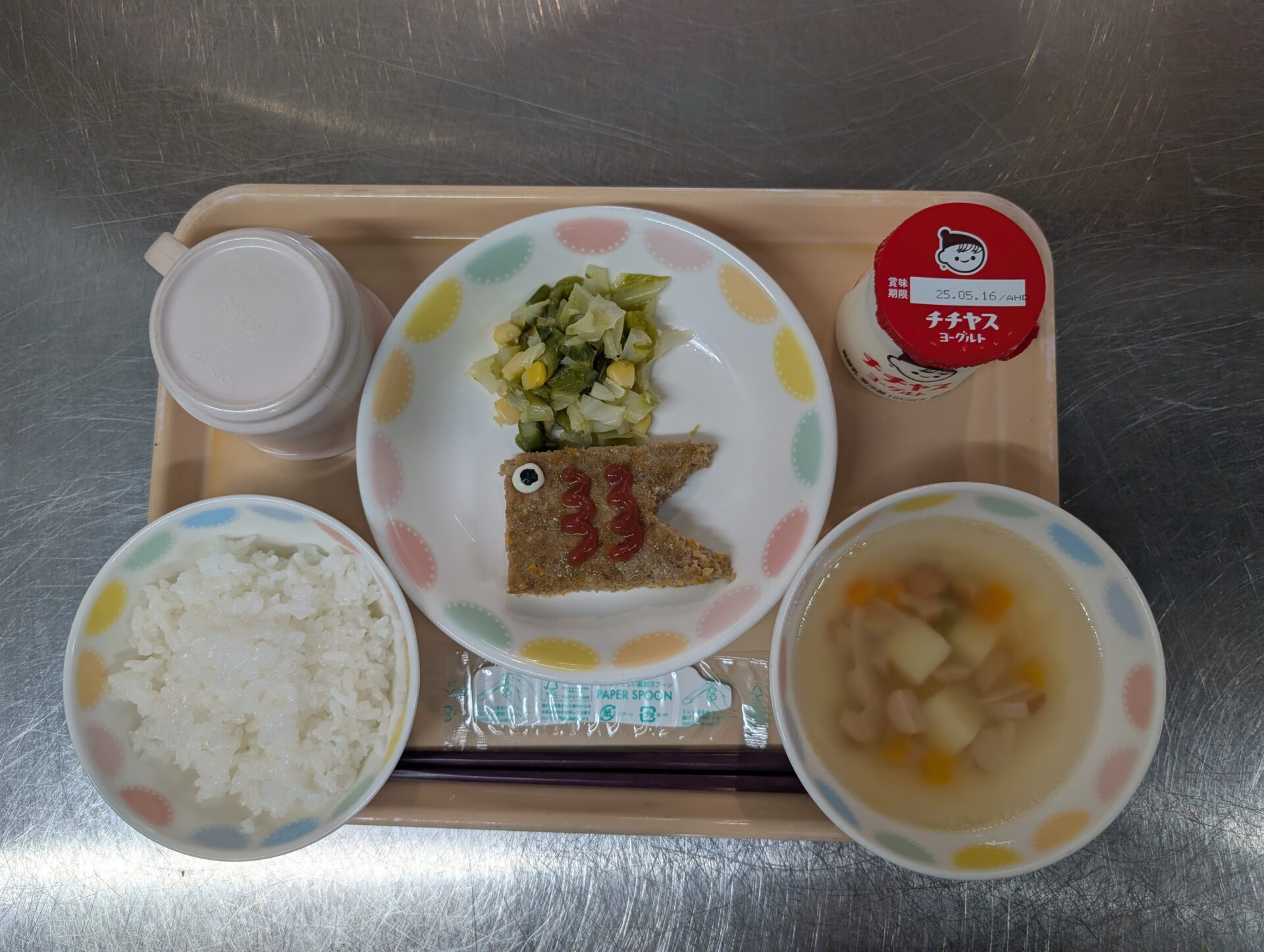 今日のメニューは、とっても可愛いかったです😊ご飯、鯉のぼりミートローフ、アスパラのマリネ、ポトフ、ヨーグルト。こどもの日にちなんで、ミートローフがこいのぼりになっていました。