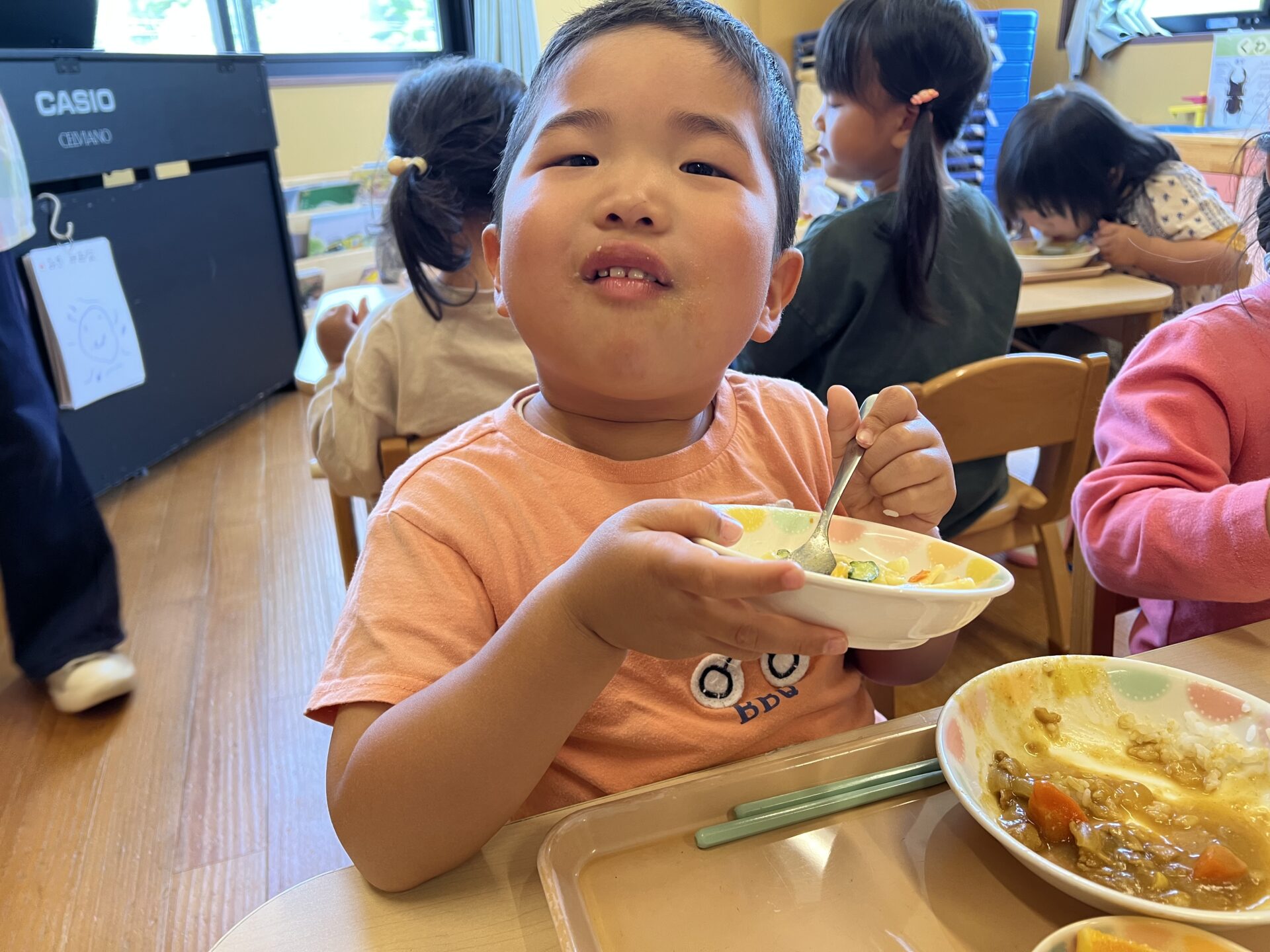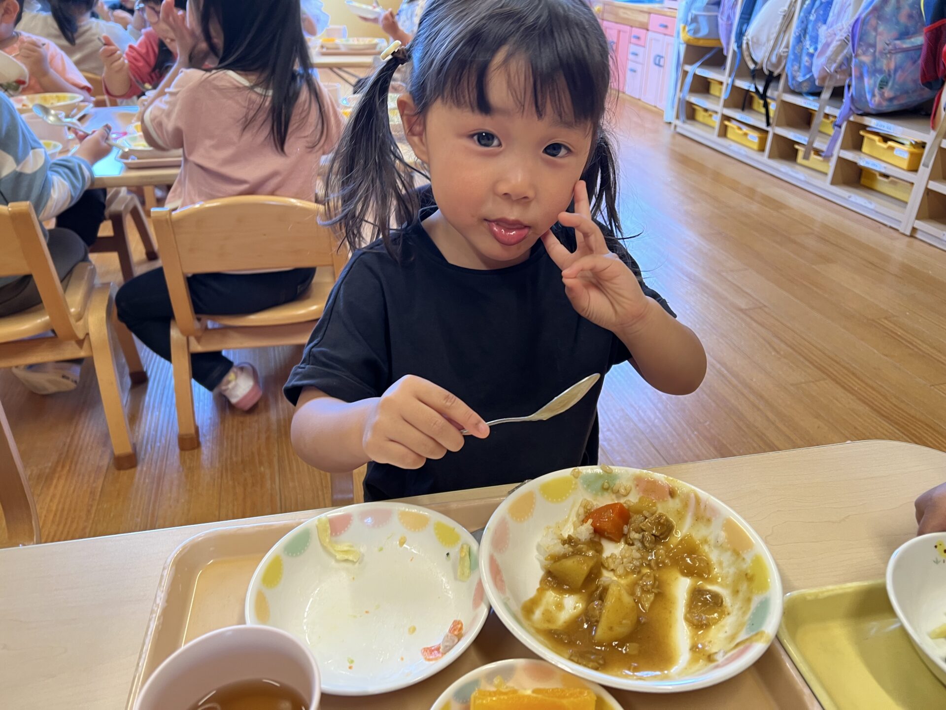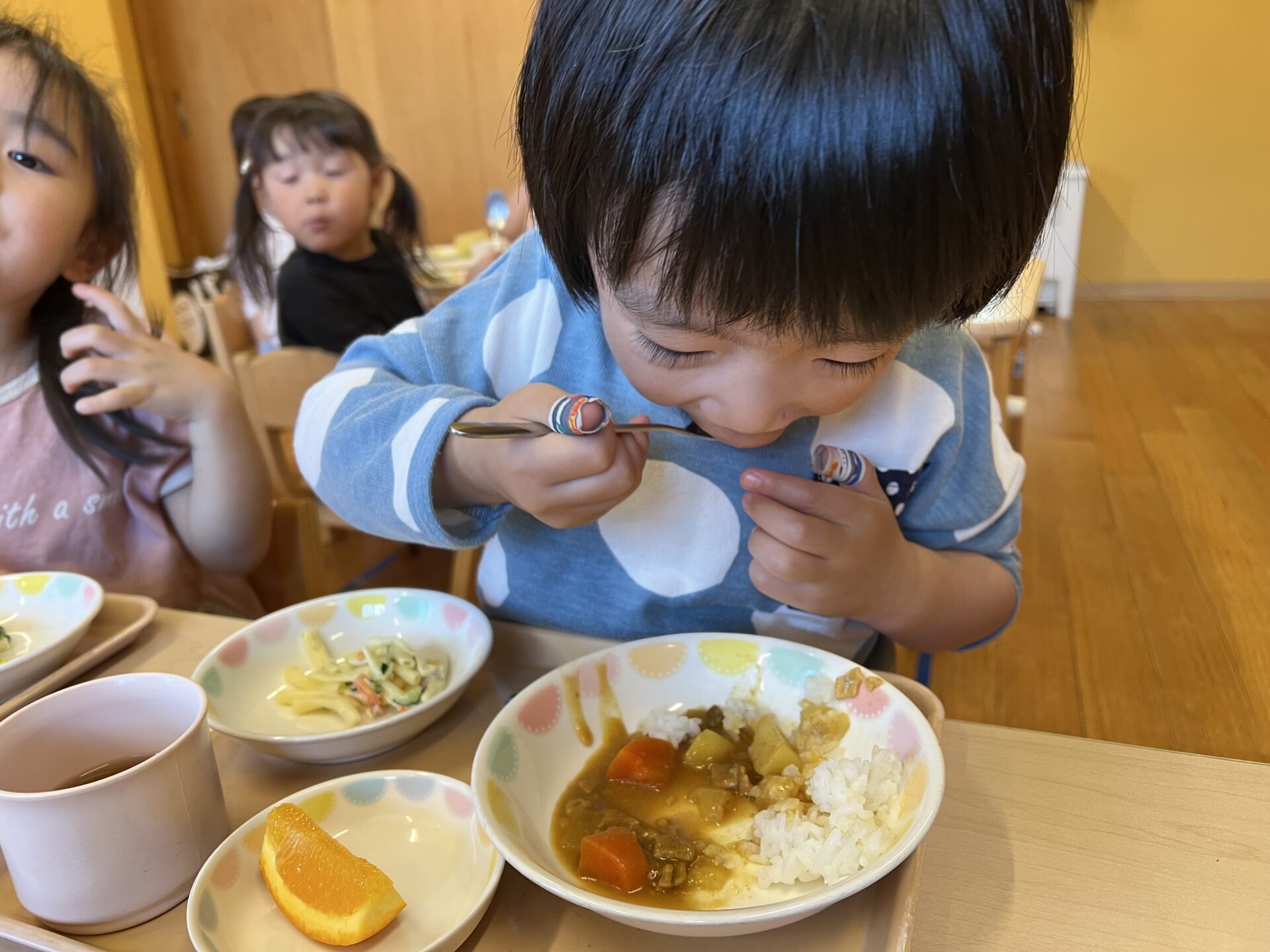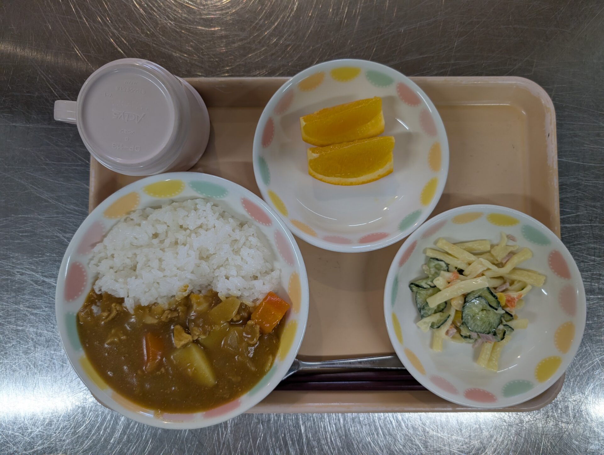 今日のメニューは、みんなの大好きなポークカレー、マカロニサラダ、オレンジです。