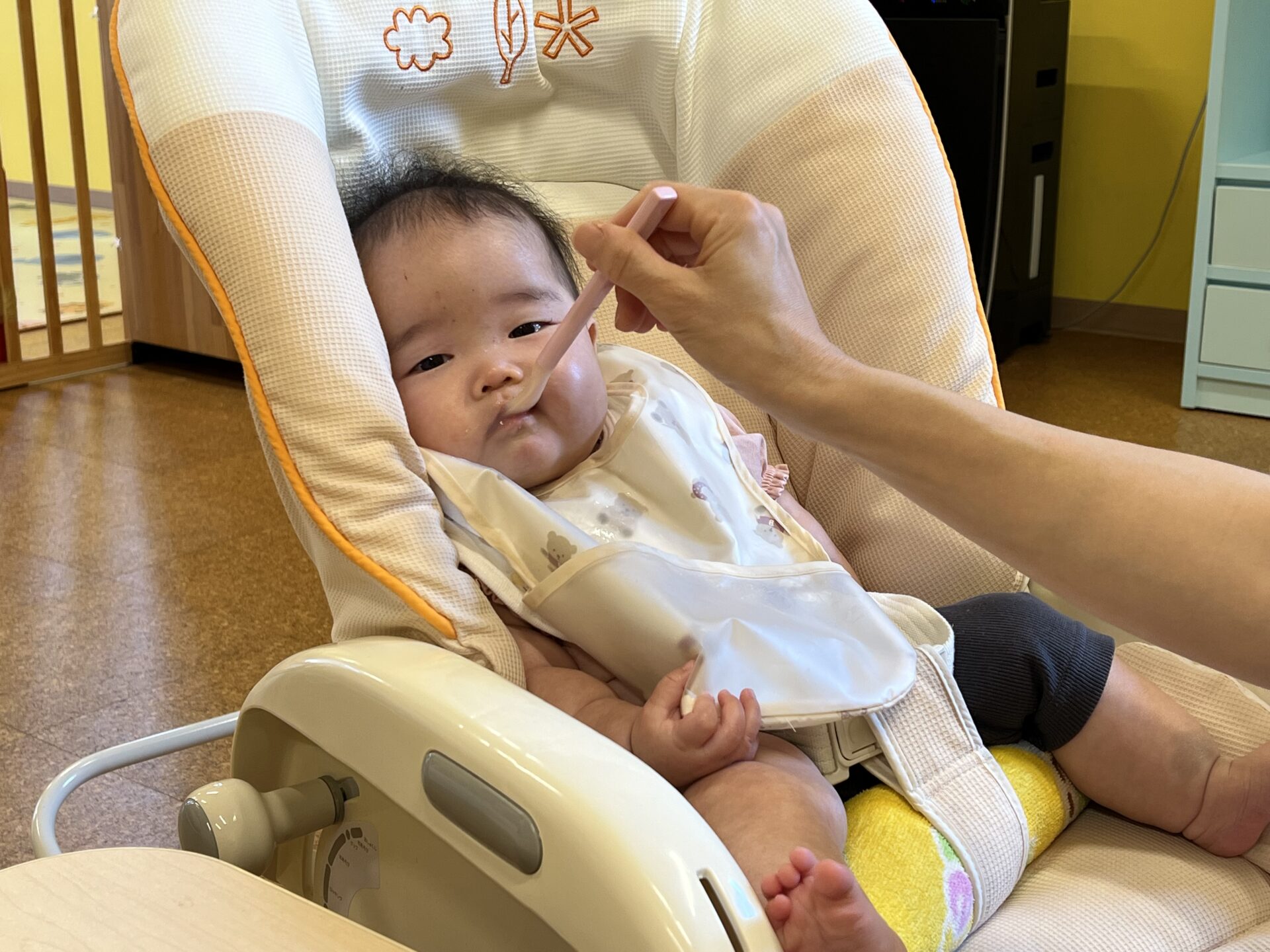 0歳児・うみチームのMちゃんが、離乳食を食べていました😊