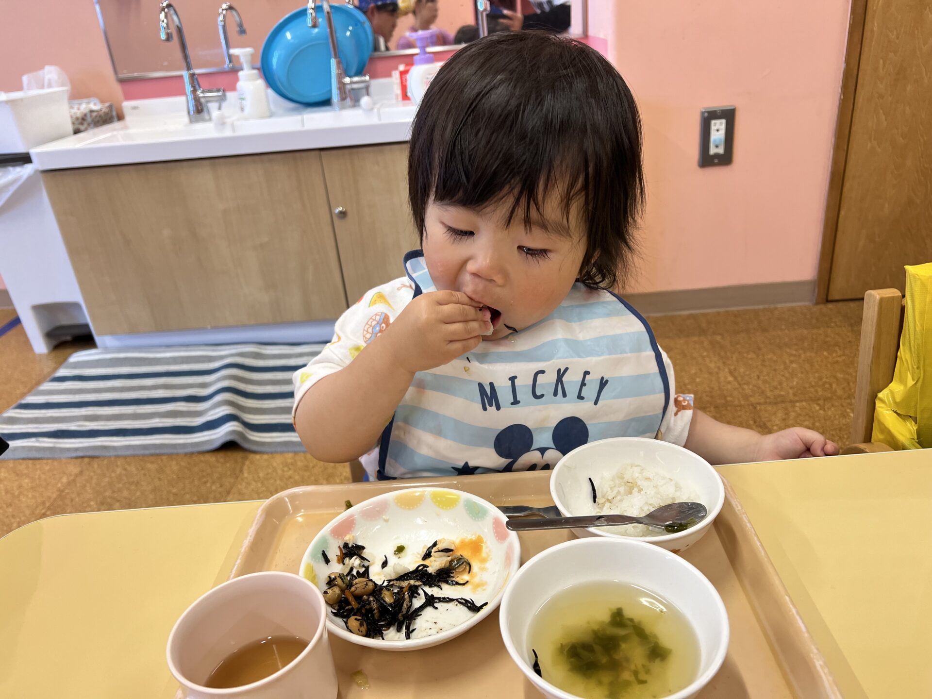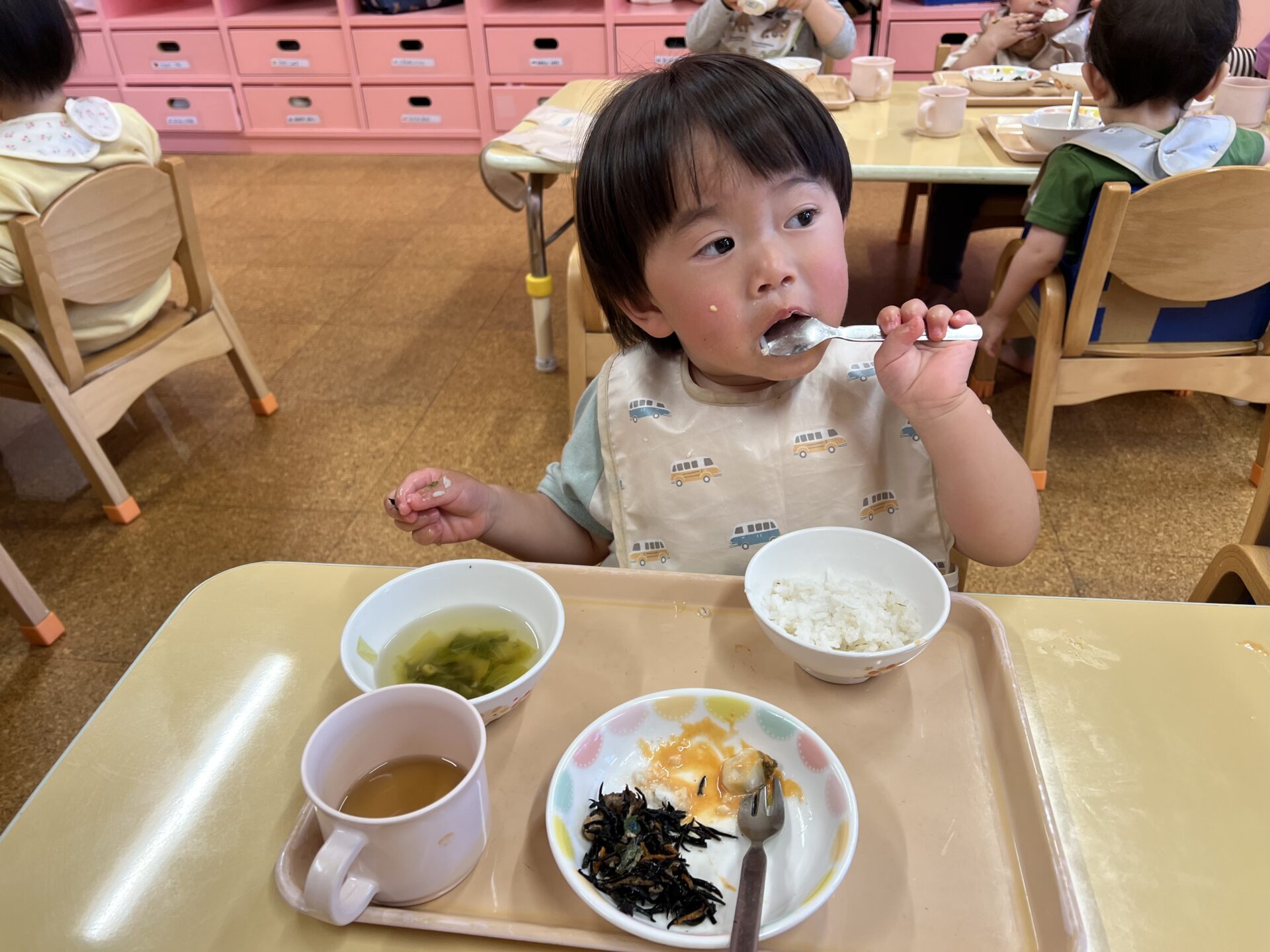1歳児・だいちチームさんも、屋上園庭でしっかり身体を動かして遊んだので、お腹ペコペコだったみたい😊お皿をしっかり持って、美味しそうに食べていました。