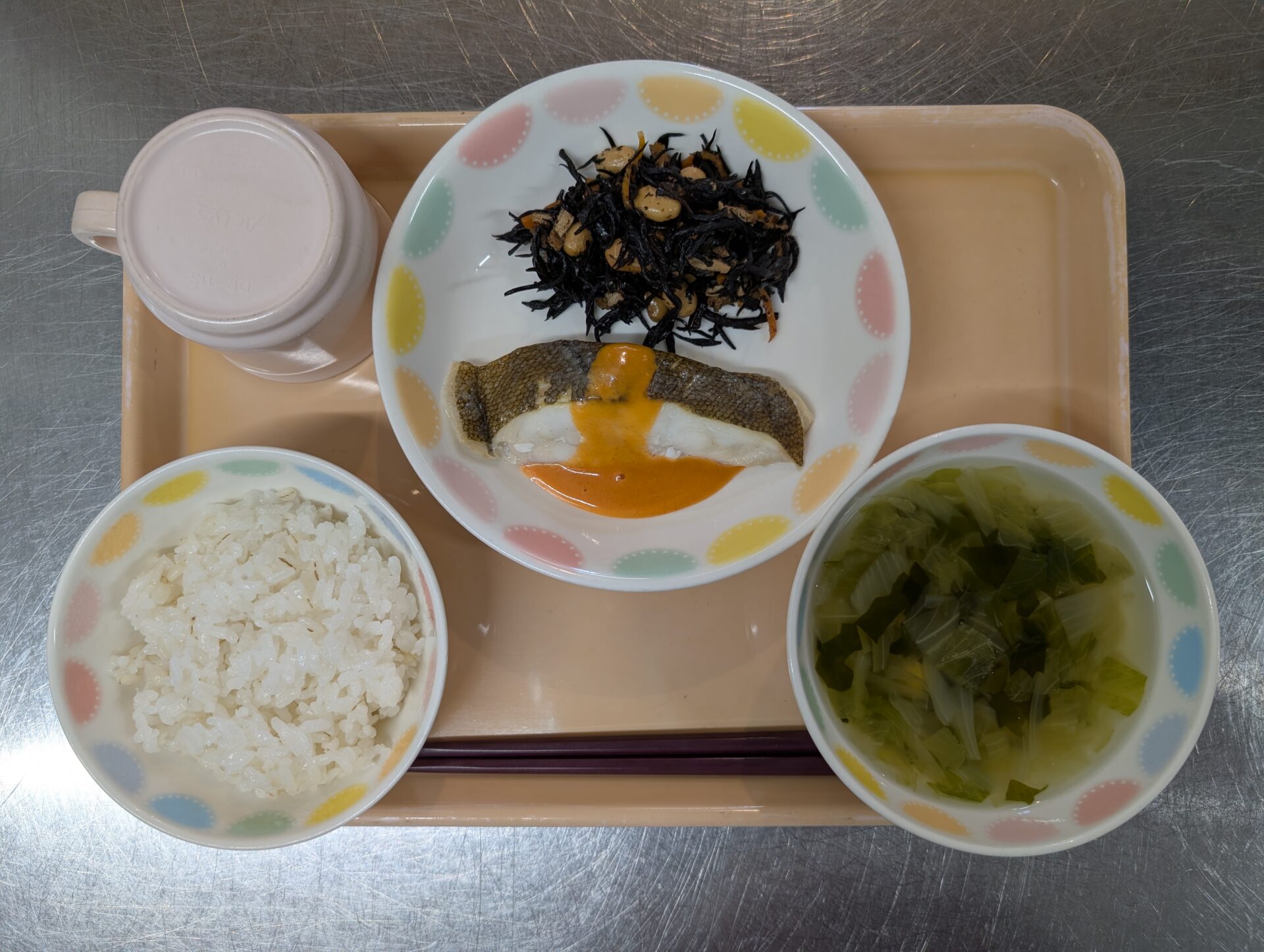 今日のメニューは、麦ご飯、カレイのオーロラソース、大豆とひじきの煮物、レタスのスープ。