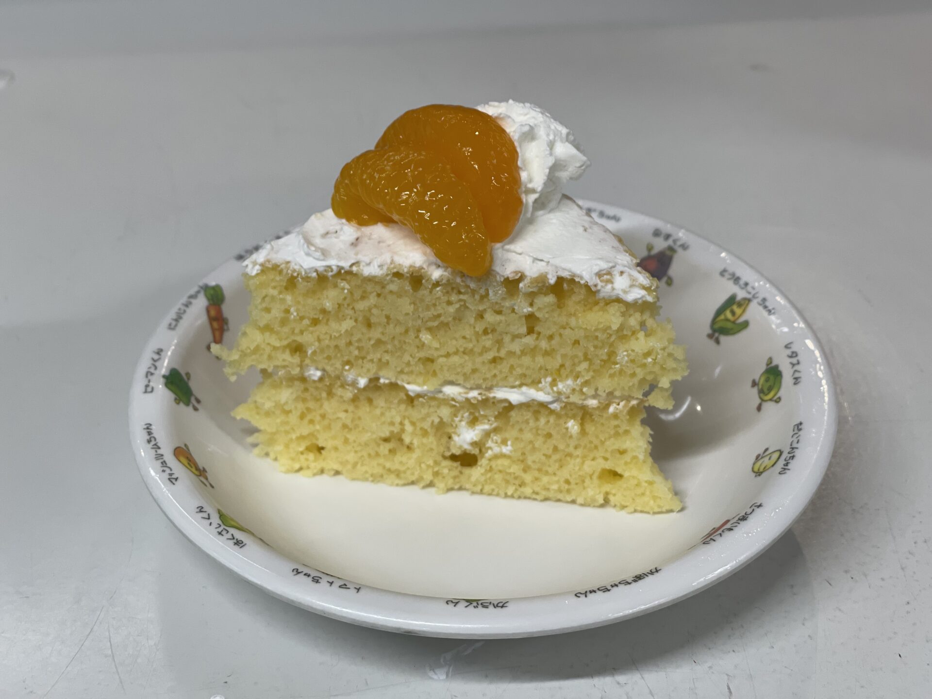 給食先生の手作りスポンジに、生クリームとみかんが乗っている、誕生会特別おやつ。