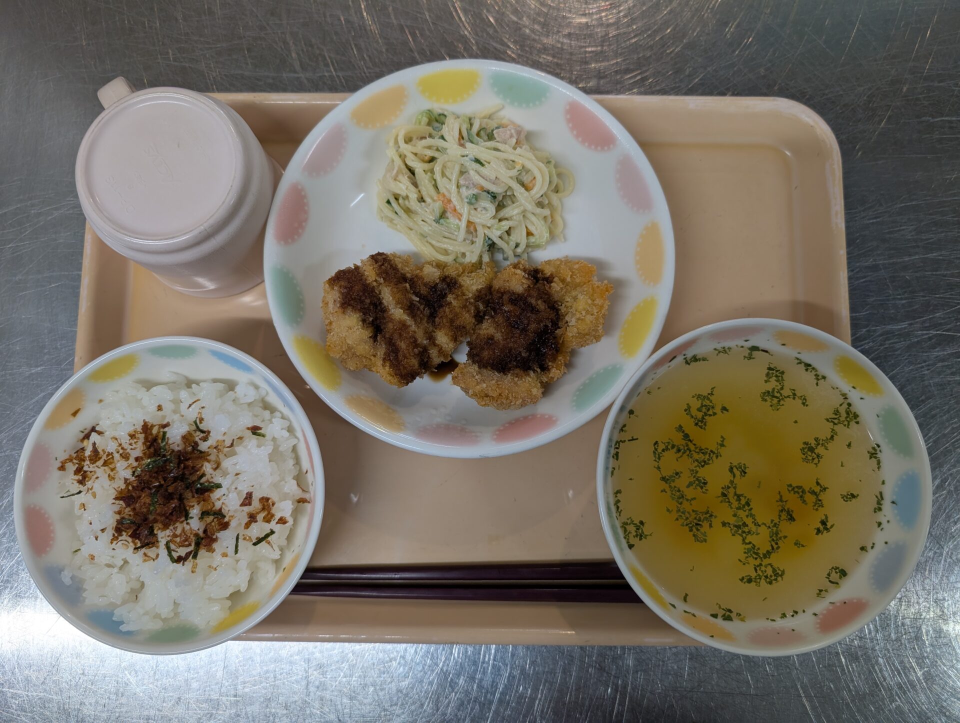 ふりかけごはん チキンカツ スパゲティーサラダ コンソメスープ