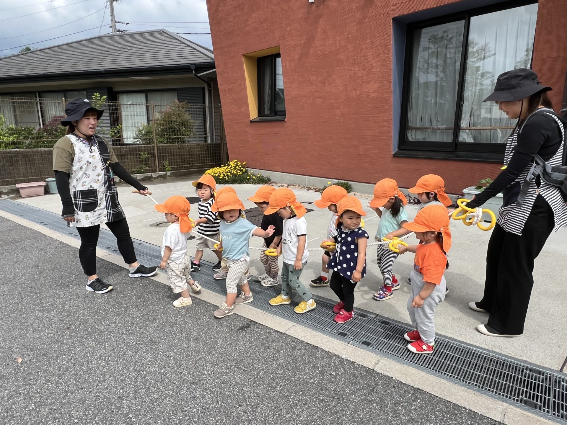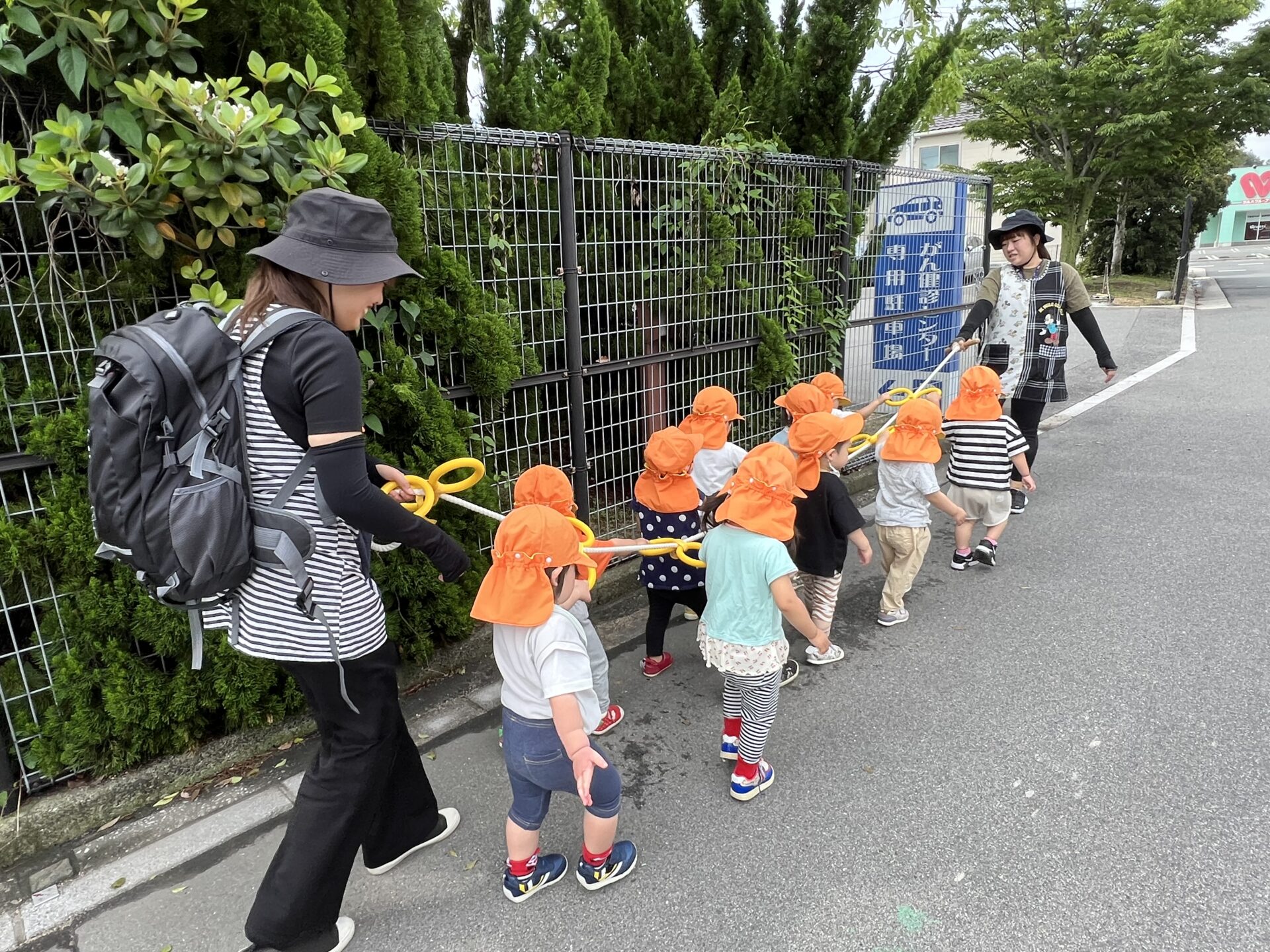 2歳児クラスになると、お散歩ロープをしっかり持って公園まで歩いて行きます。