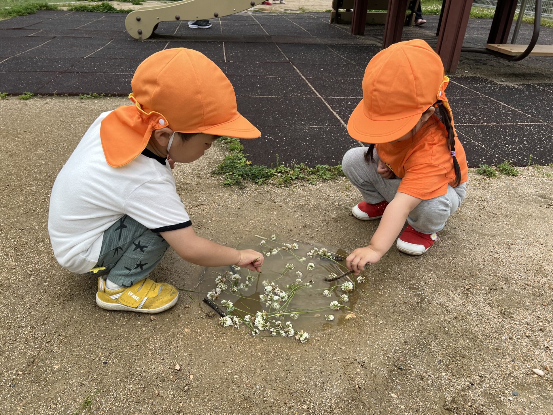 水たまりを見つけて、シロツメクサを入れて、スープを作っているそう💗