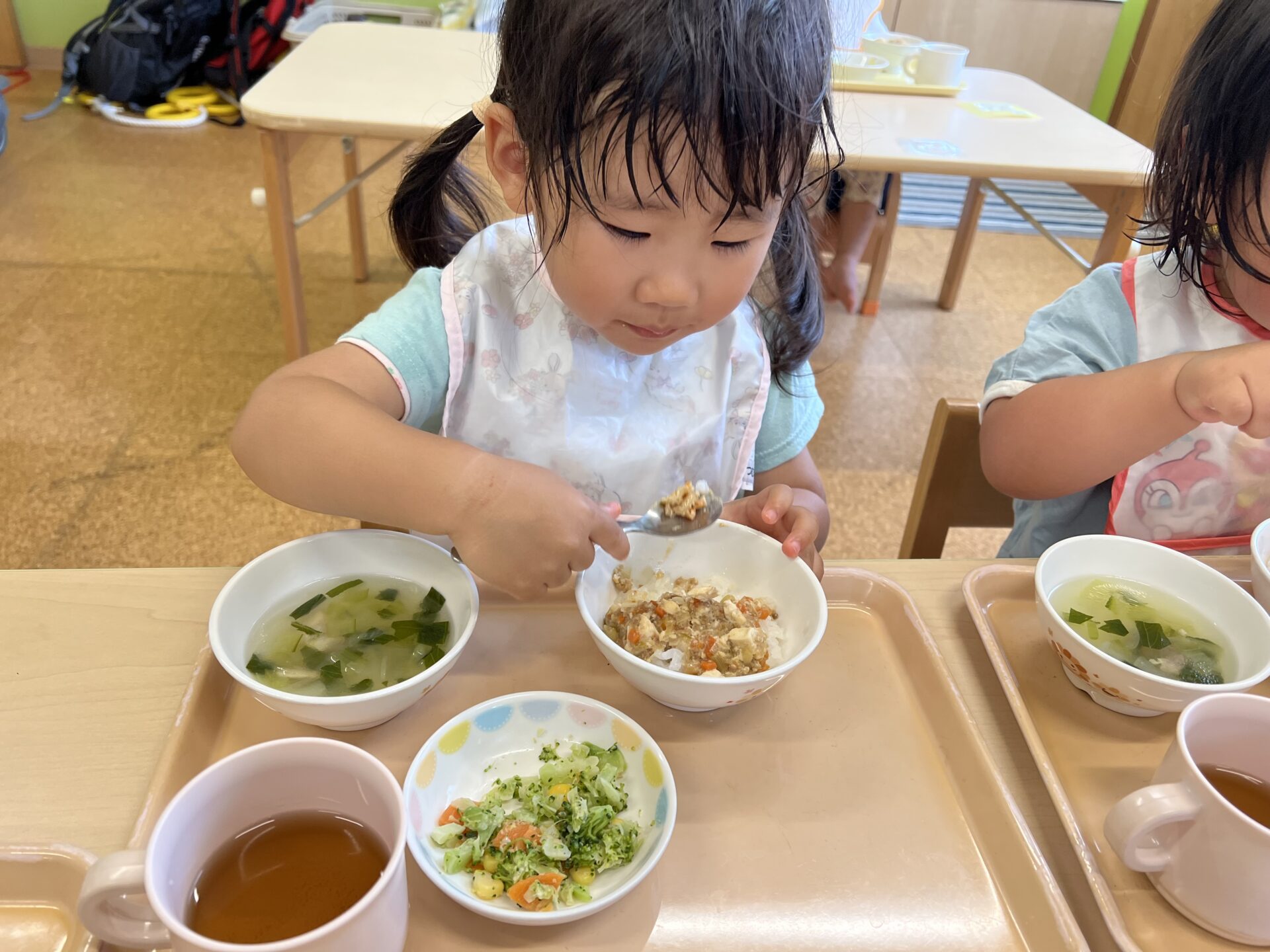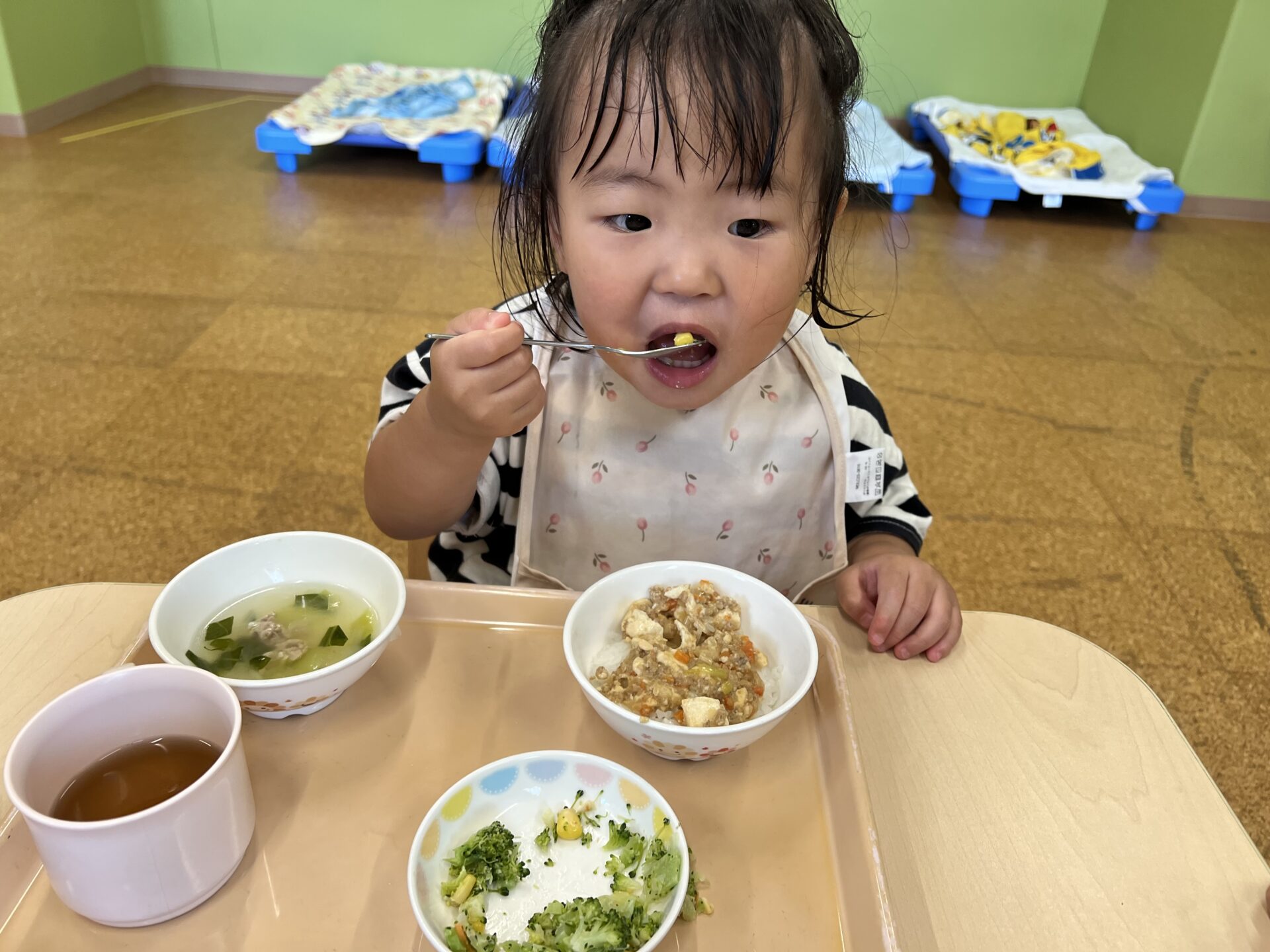 たくさん遊んだので、お腹がペコペコだったみたい。モリモリ食べていました😊
