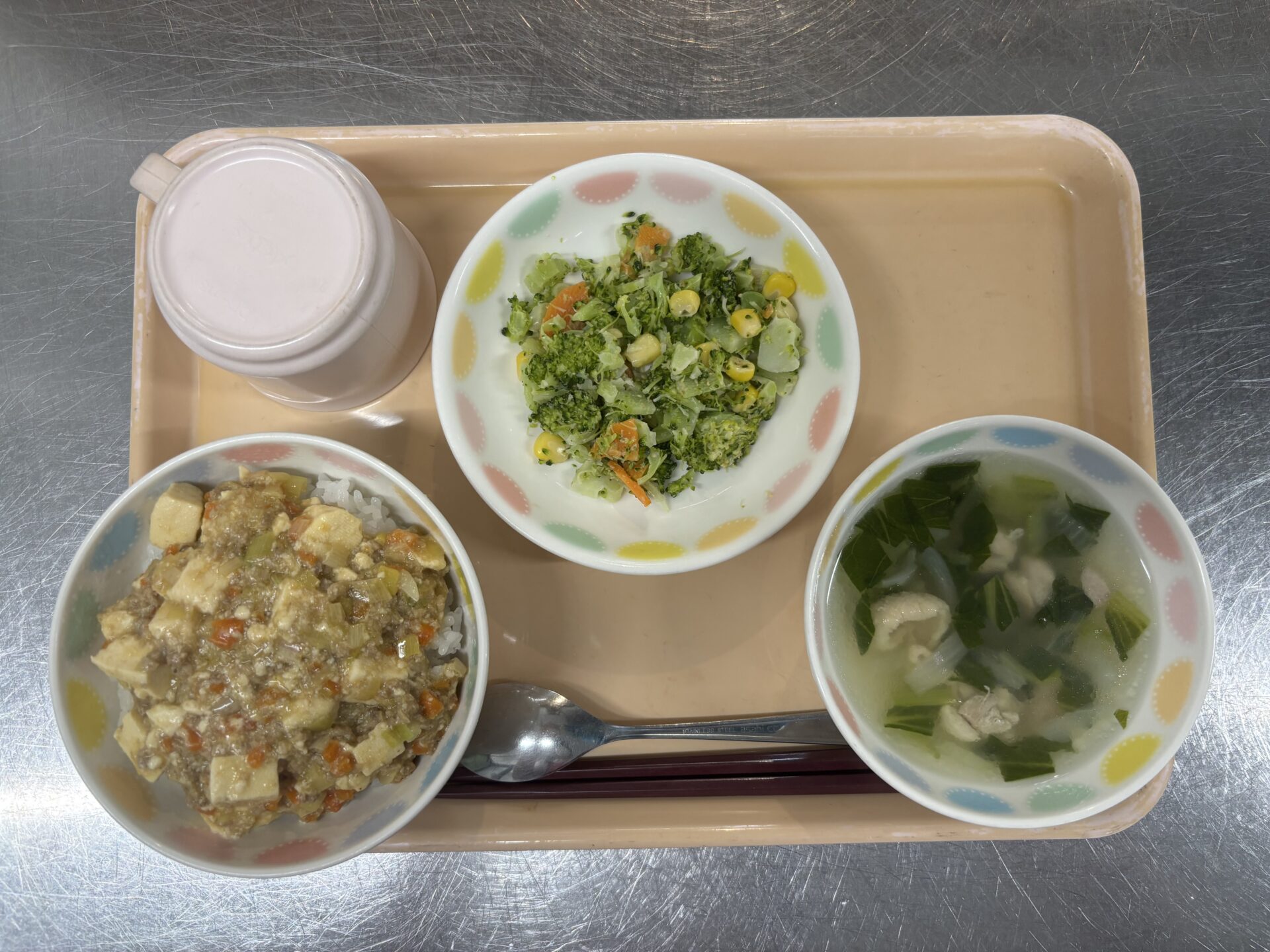 今日のメニューは、麻婆丼、ごまだれサラダ、春雨スープです。