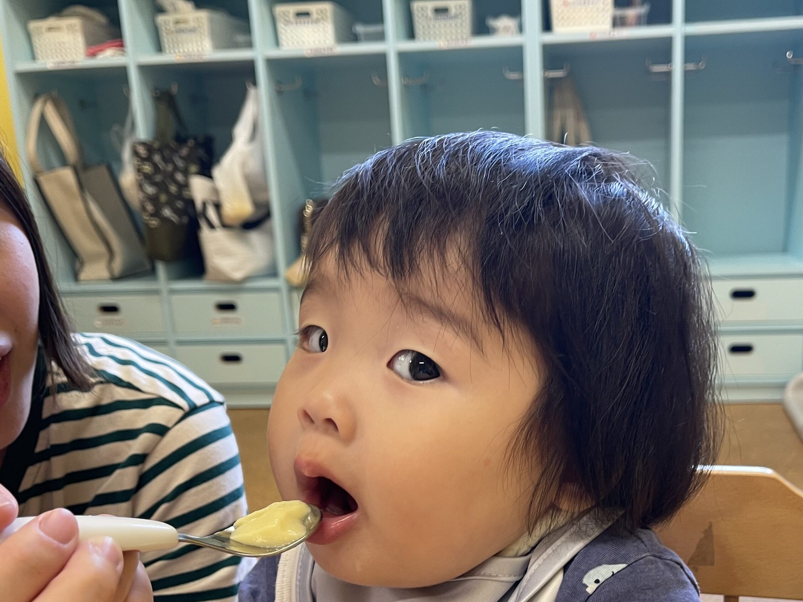 楽しく過ごした後、完了食・後期食の子は一緒におやつを食べました😊ミルクの子は、保護者の方に飲ませてもらいました。
