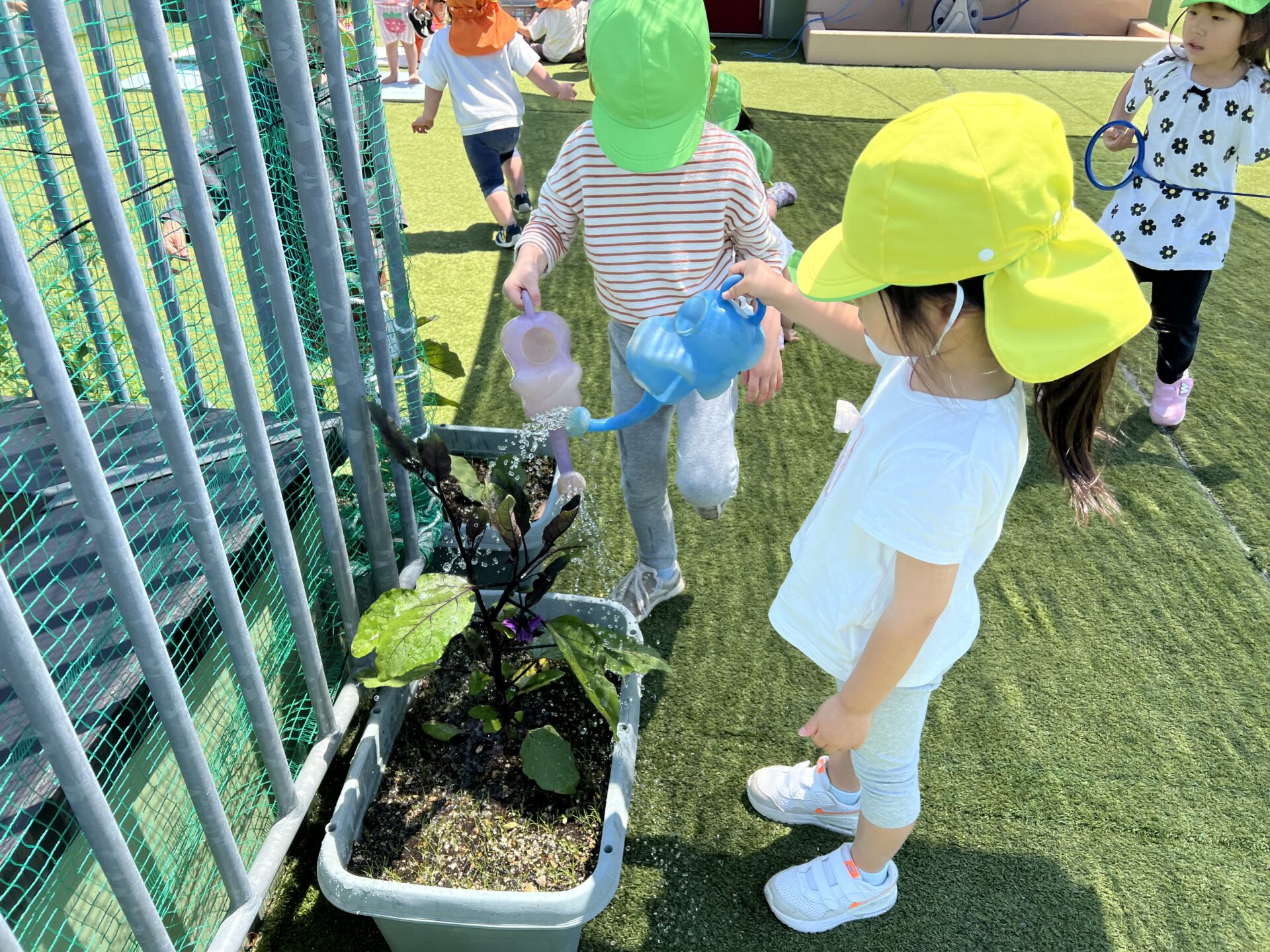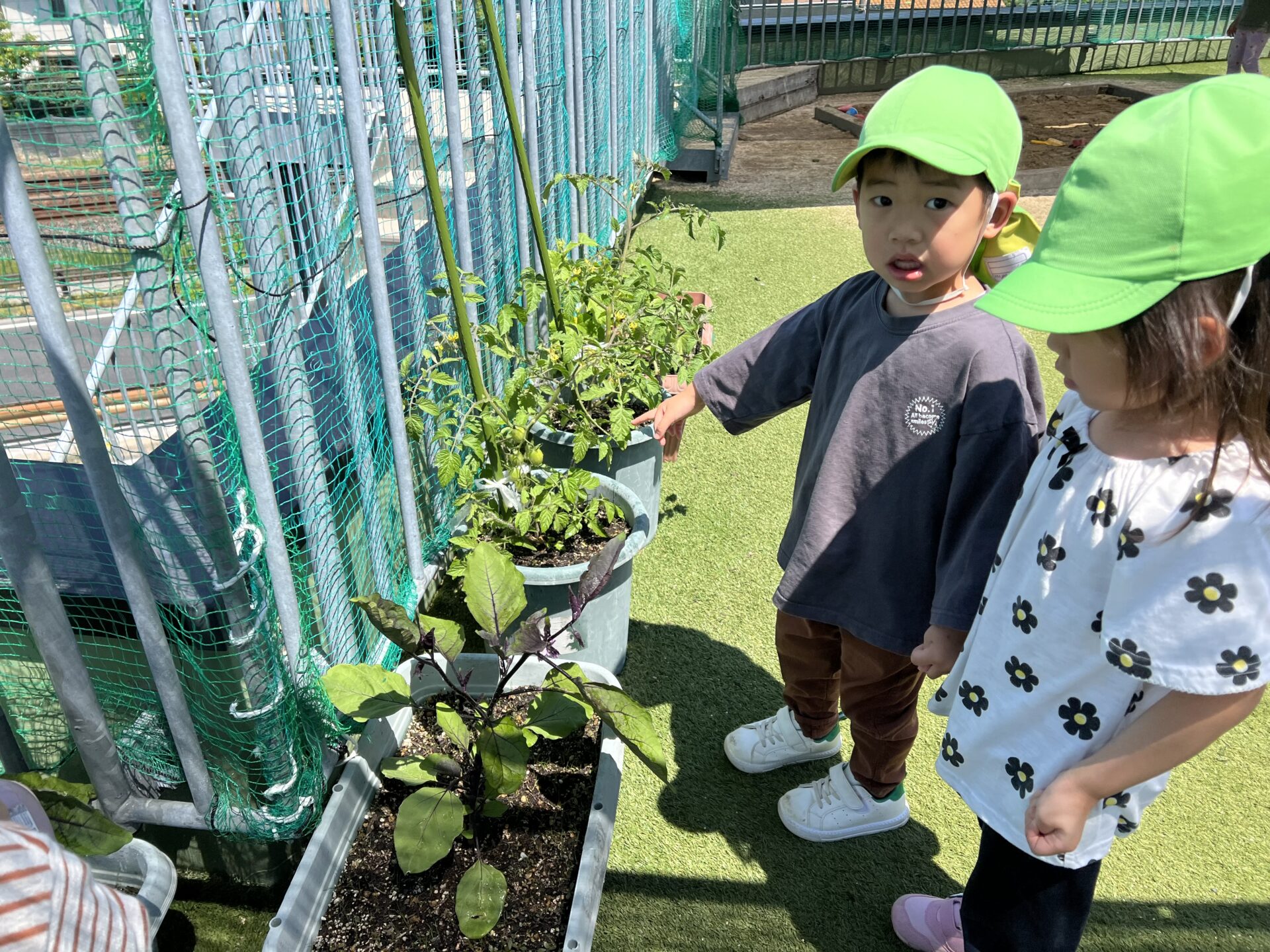ちょうど、4歳児・そらチームさんがお世話している夏野菜は、トマト🍅お当番さんが忘れずに毎日水やりをしてくれているおかげで、すくすく育っています😊