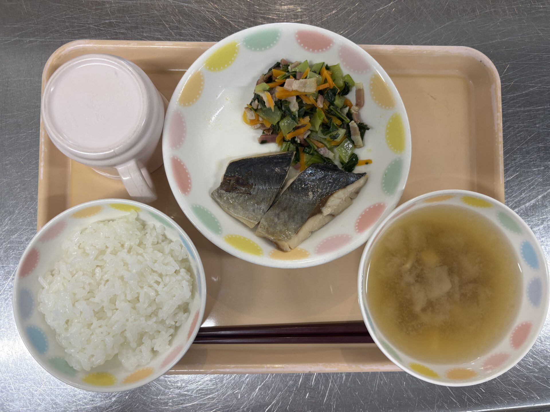 今日のメニューは、ご飯、あじの煮つけ、チンゲン菜とベーコンのソテー、大根と舞茸の味噌汁です。