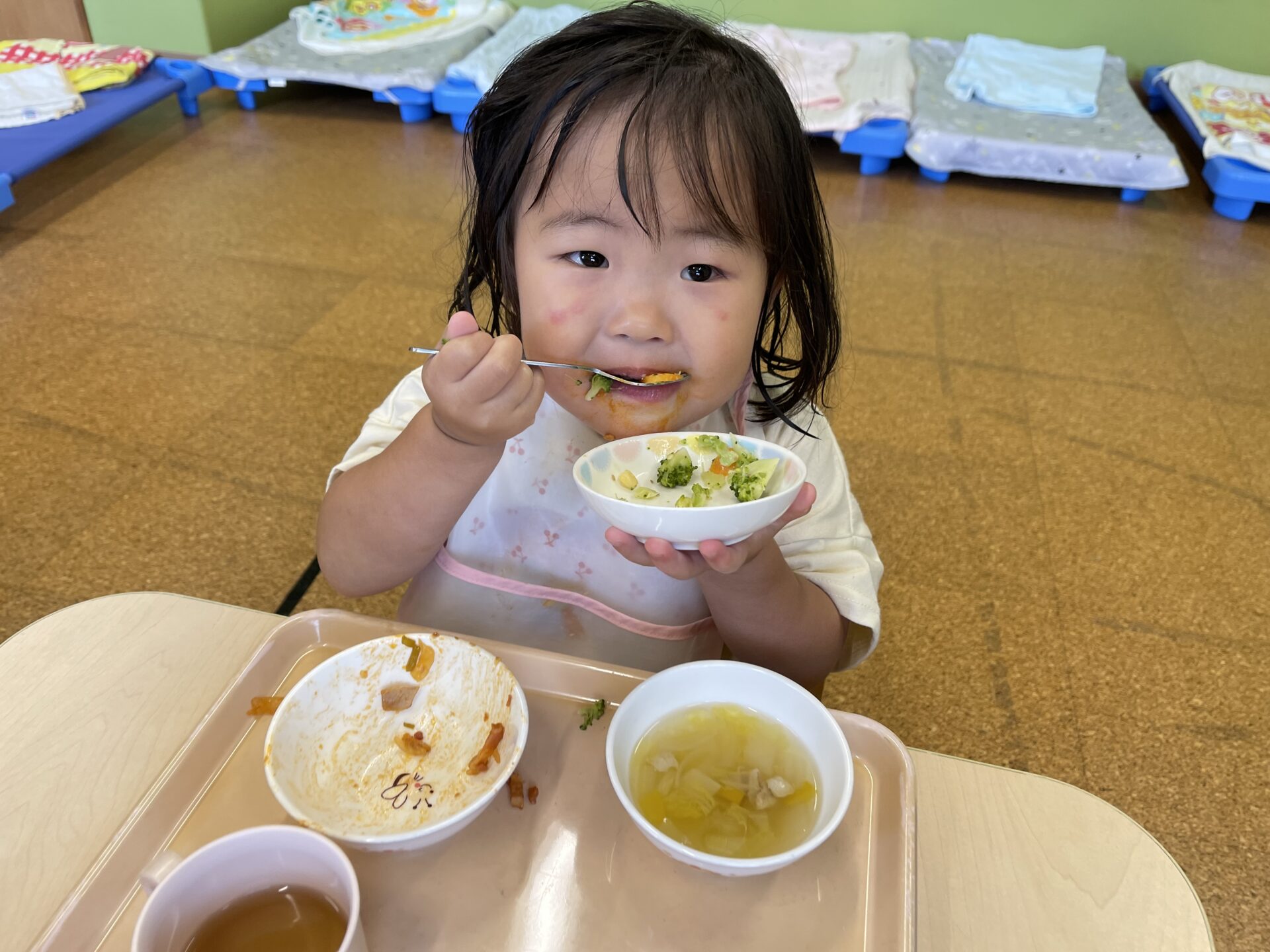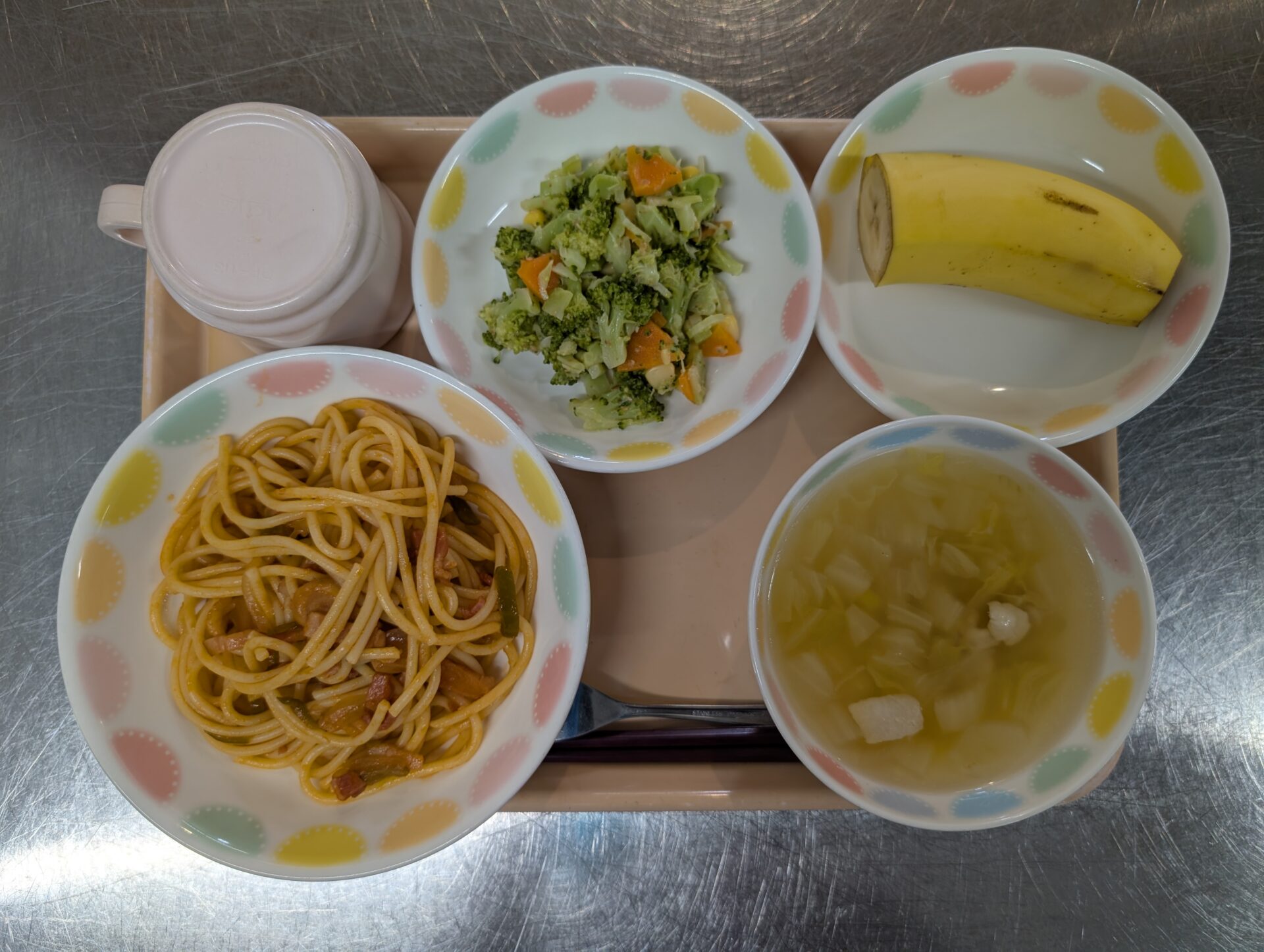 絵の具をきれいに洗い流し、さっぱりした後の給食メニューは、スパゲッティナポリタン、ブロッコリーのサラダ、コンソメスープ、バナナです。