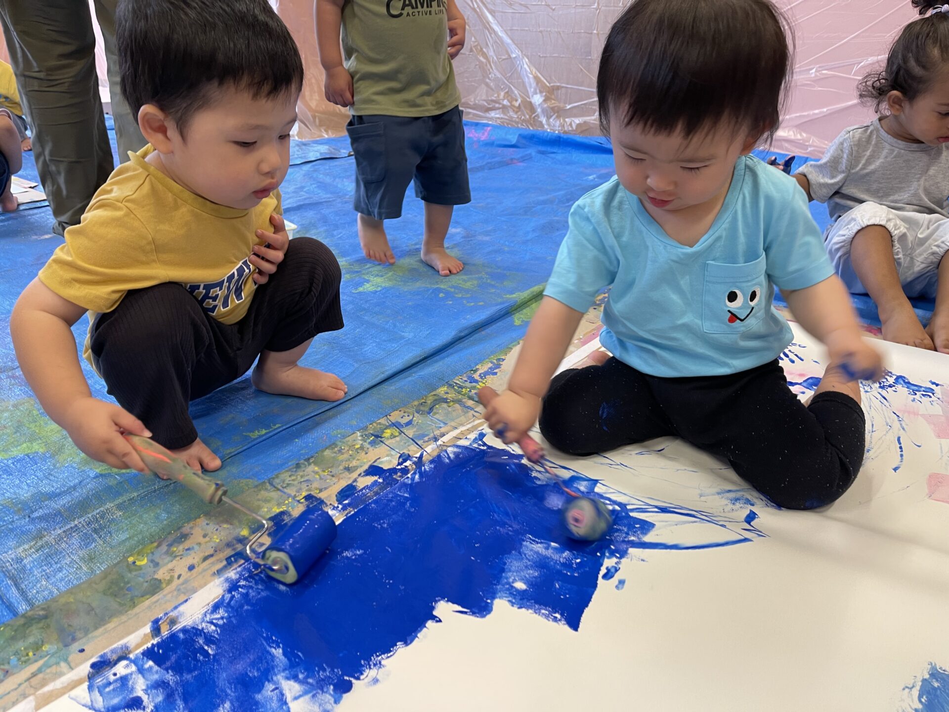 2歳児・あめチームさんになると、遊び方がさらにダイナミックになり、お友達同士、塗りあいこ。これが、一番楽しいんです😊詳しくは、ブログ【だいち・あめ・絵の具遊び】編をご覧ください。