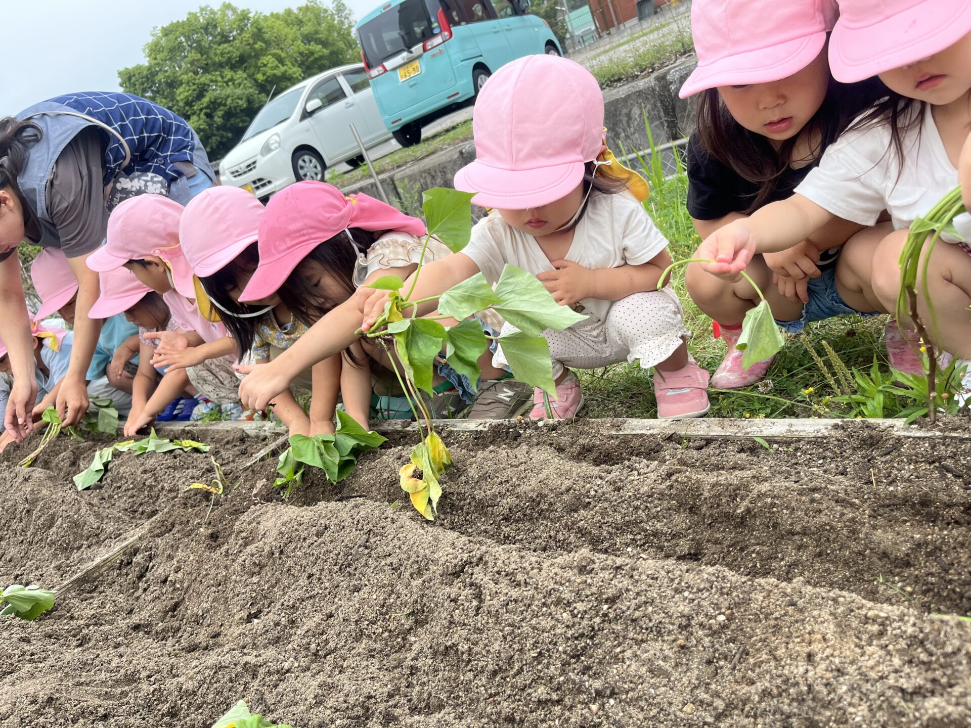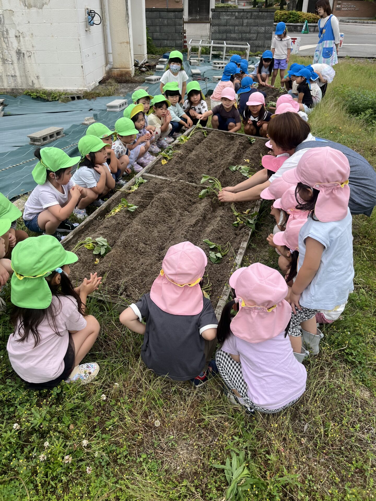 今日は、雨が降り始める前に、3~5歳児クラスにじ・そら・くじらチーム合同で、さつまいもの苗植えをしました😊