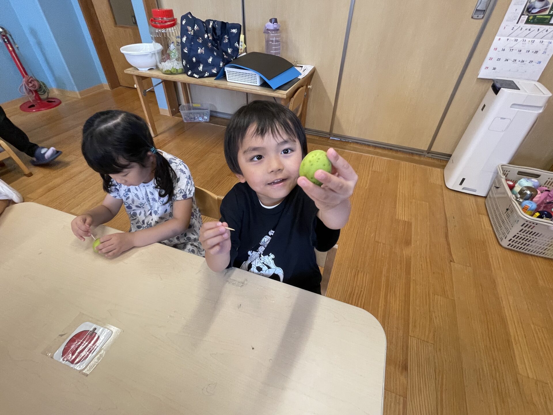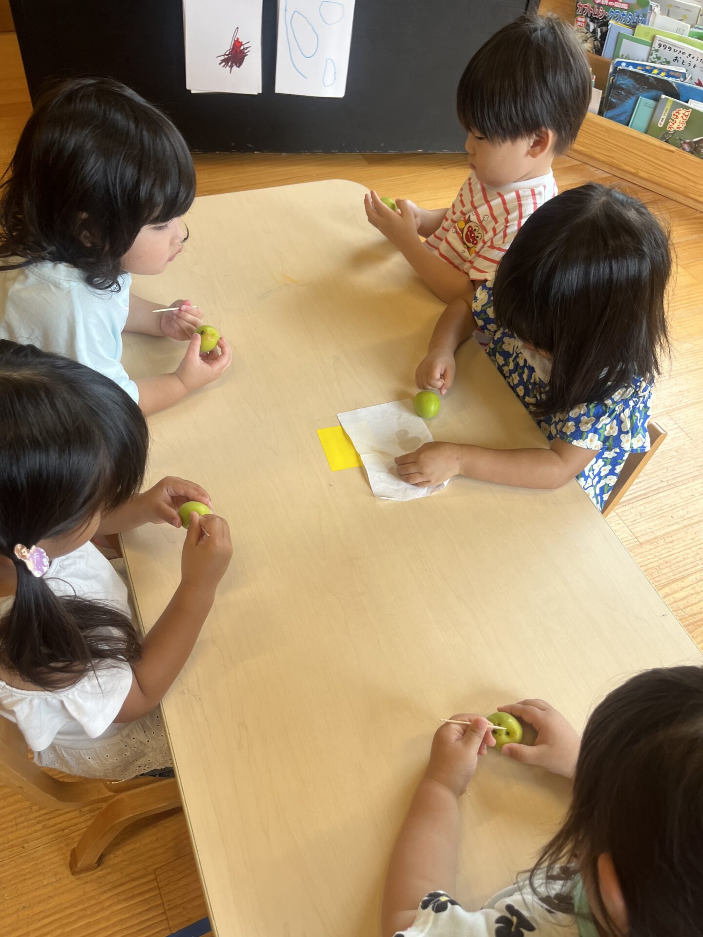 爪楊枝を使って、小さなうめの‘’おへそ”を取っていきます😊3歳児クラスにじチームさんも、真剣に取っています。