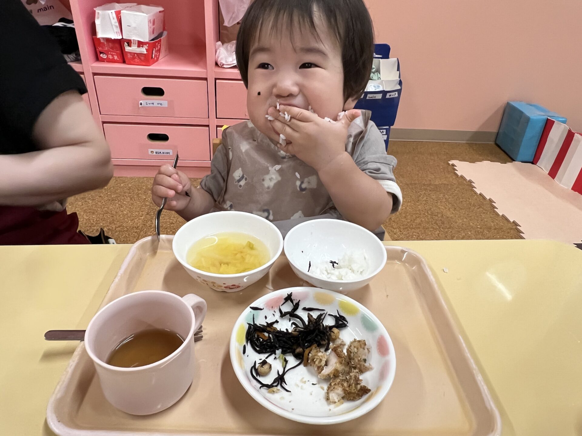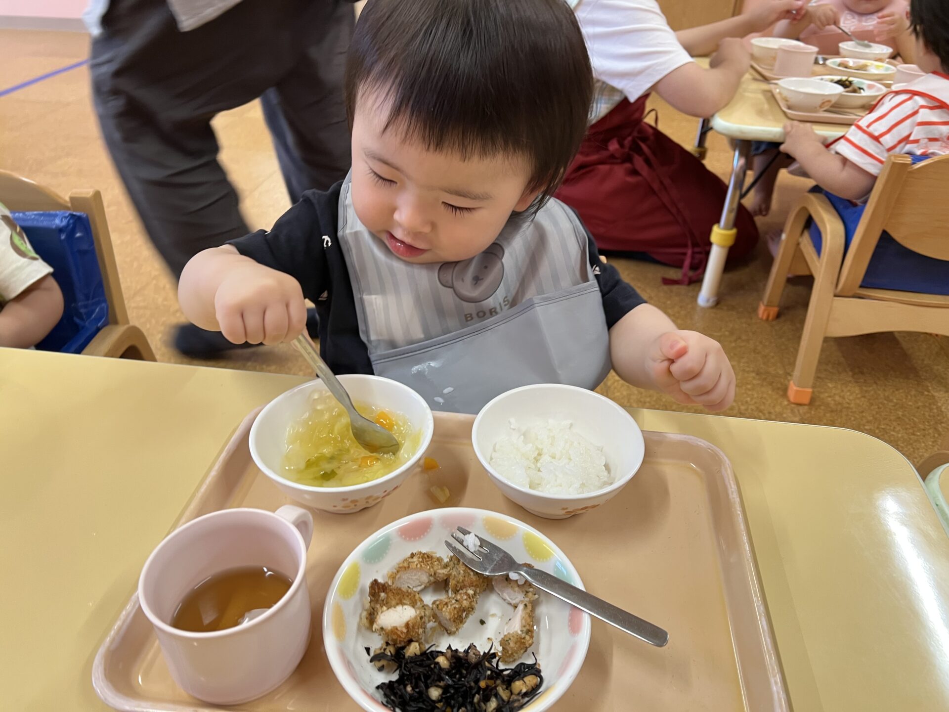 雨上がりの屋上園庭で、久しぶりに戸外遊びができた乳児チームさんたち。お腹がペコペコだったみたいで、美味しそうに食べていました。