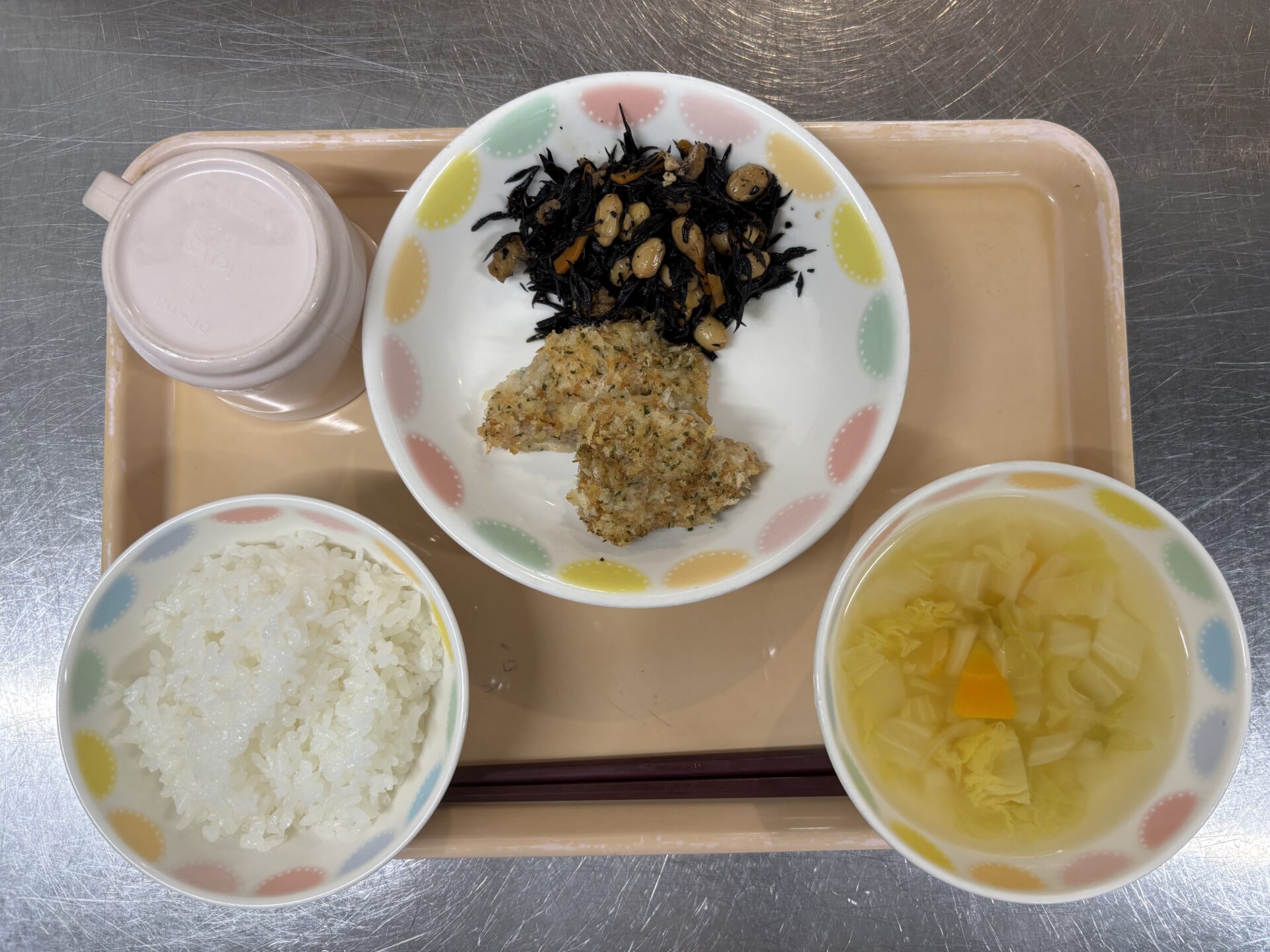 今日のメニューは、ご飯、鶏肉のパン粉焼き、大豆とひじきの煮物、白菜のスープ。