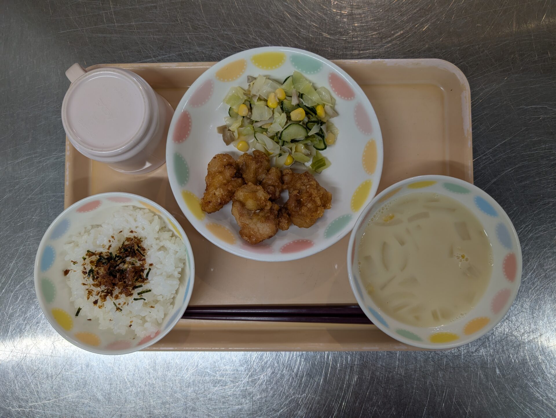 お誕生日メニューは、ご飯、鶏のから揚げ、きのこサラダ、コーンスープです😊子ども達は、「やったー!から揚げ大好き💗」と人気のメニューです。