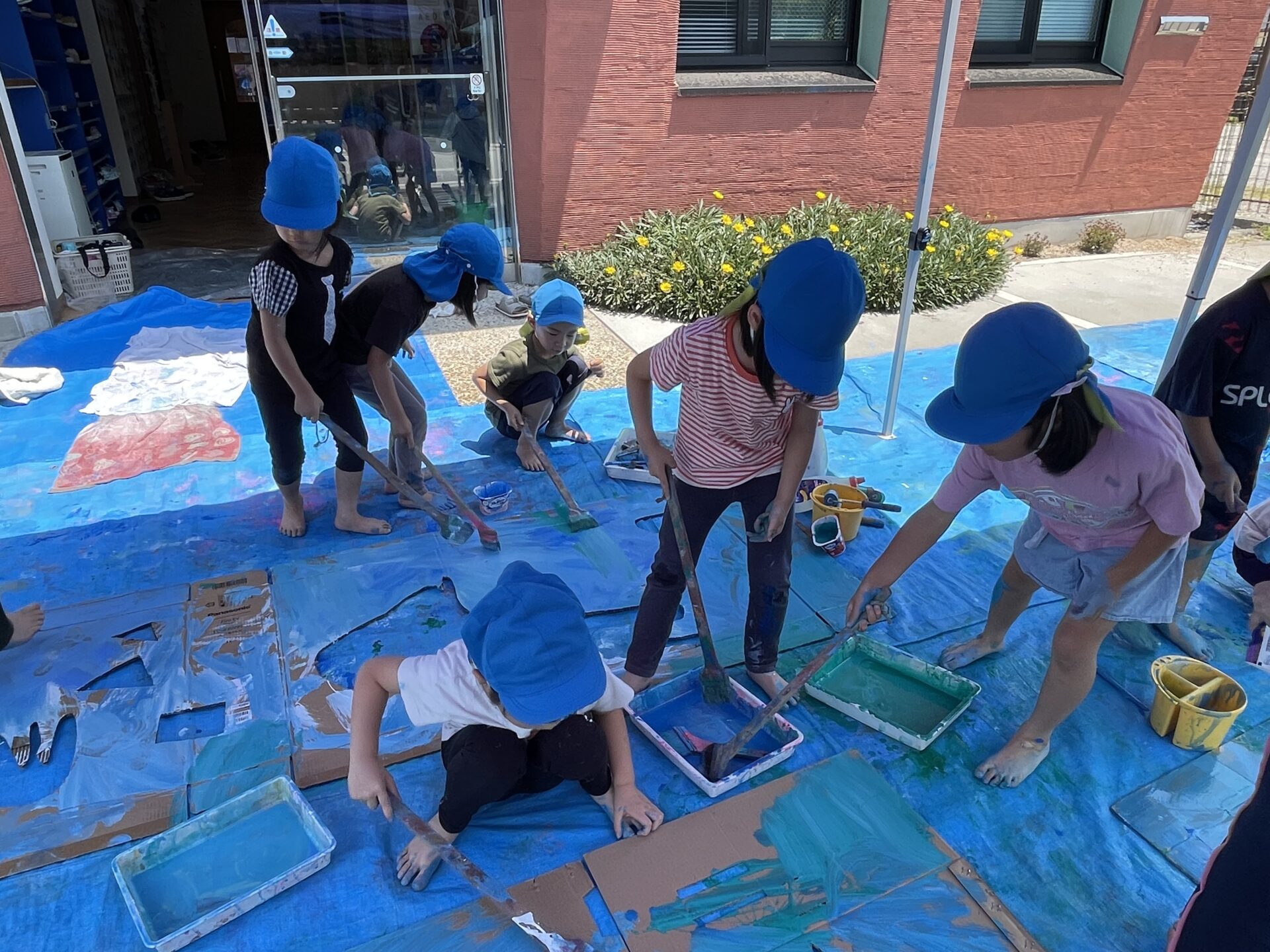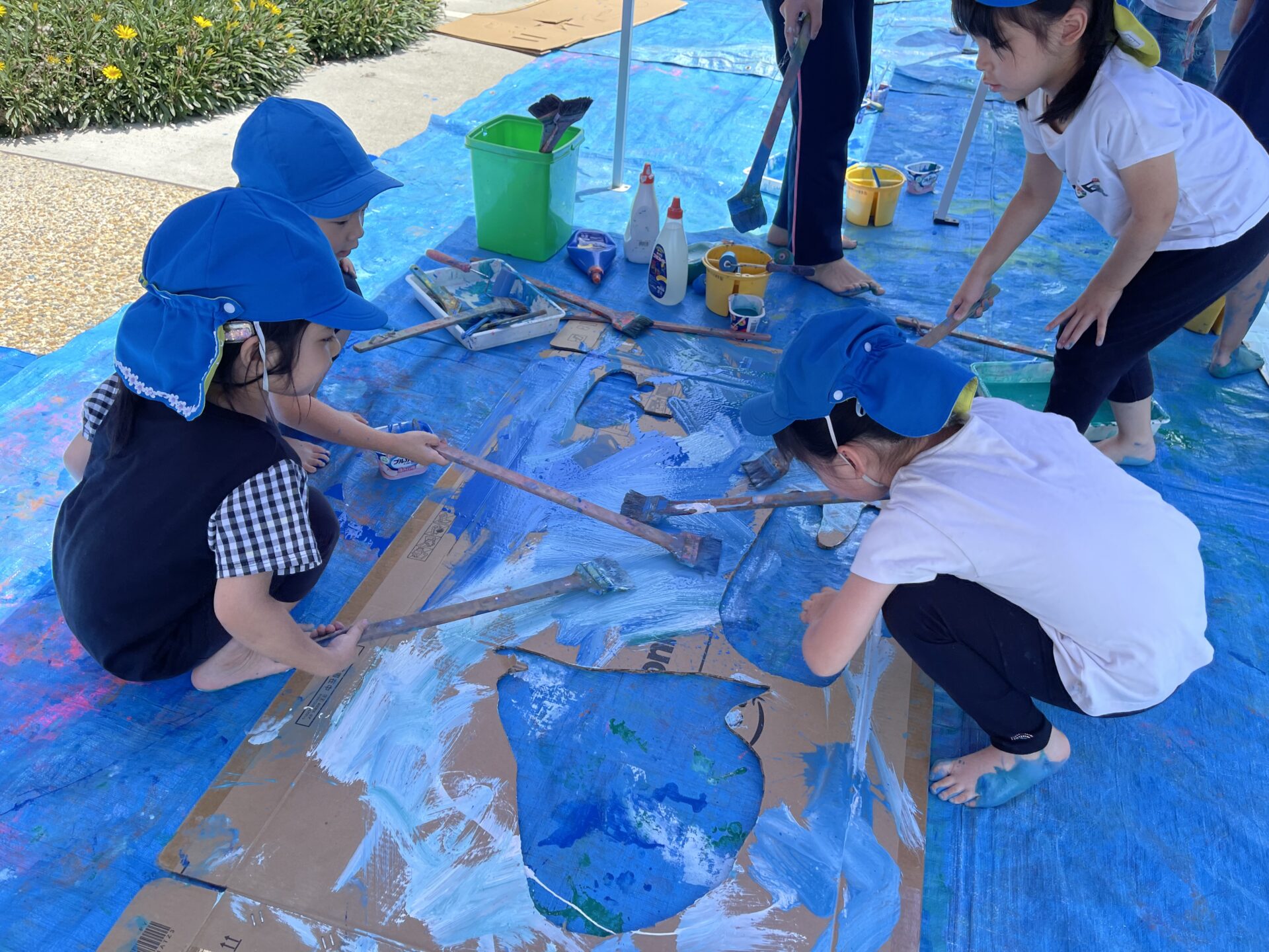 今日は、5歳児・くじらチームさんが【くじらすいぞくかん】に向けて、絵の具遊びをダイナミックに行っていました😊
