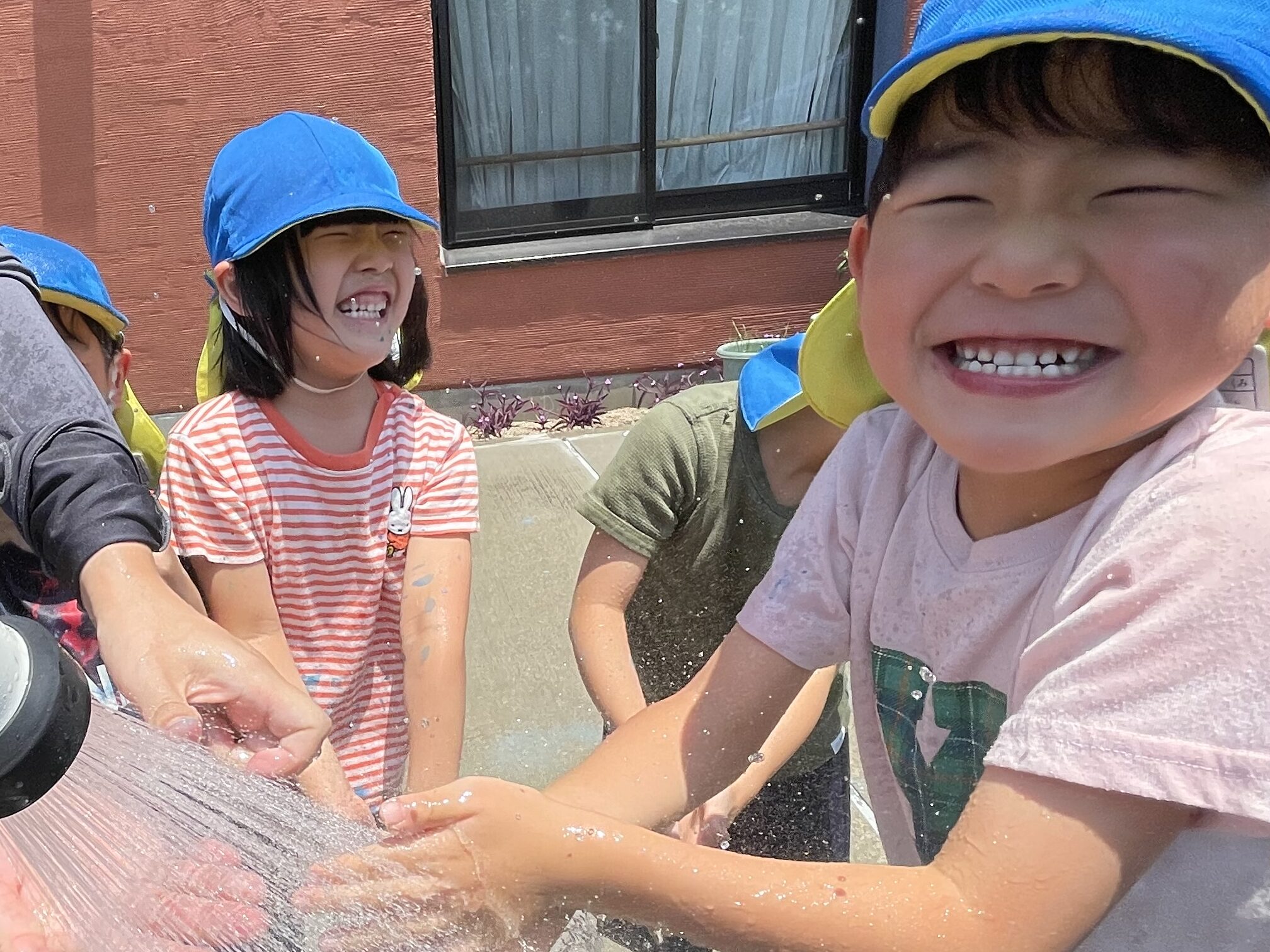 絵の具遊びの後は、シャワーで洗い流します。これがまた楽しい時間😄冷たい水が気持ちい!!