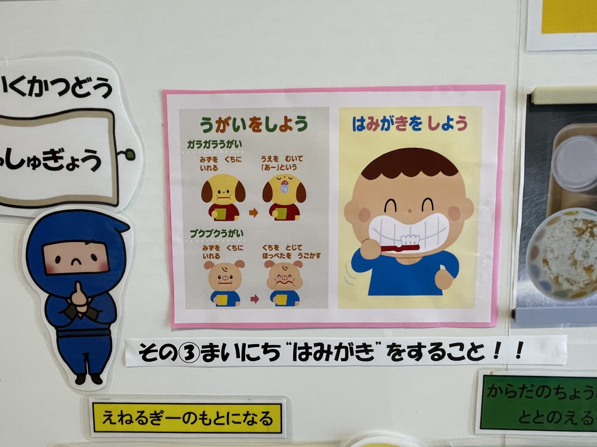 その③まいにち”はみがき”をすること!!先日、歯科検診もあったので子ども達に、歯みがきの大切さを話しました。今日の『かみかみメニュー』も、しっかり噛んで食べていたくじらチームさんです。