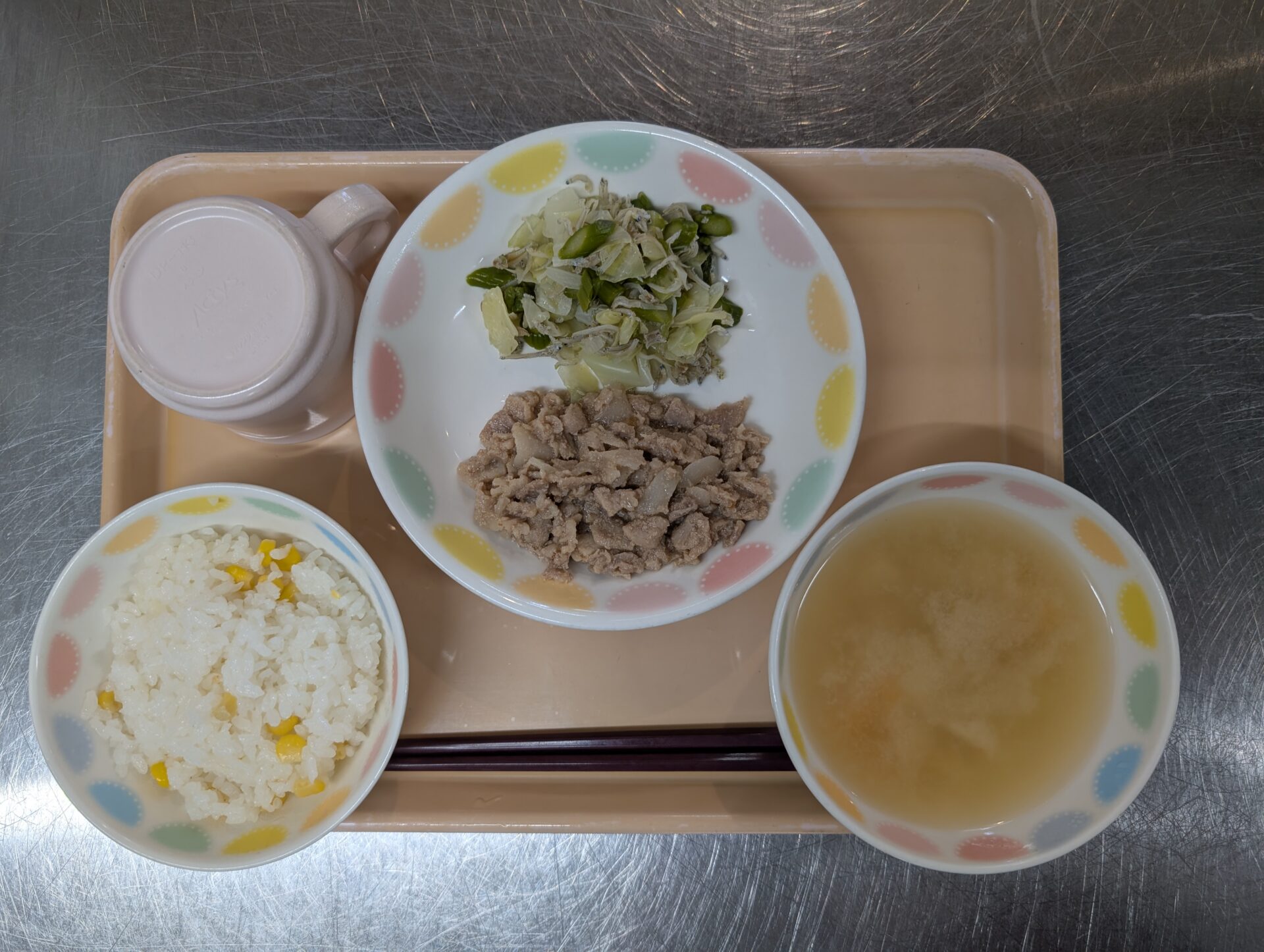 そして今日は、【食育の日】。いつもは、郷土料理の提供ですが、6月ということで『かみかみメニュー』でした😊とうもろこしごはん、豚肉のくわ焼き、かみかみサラダ、里芋の味噌汁。