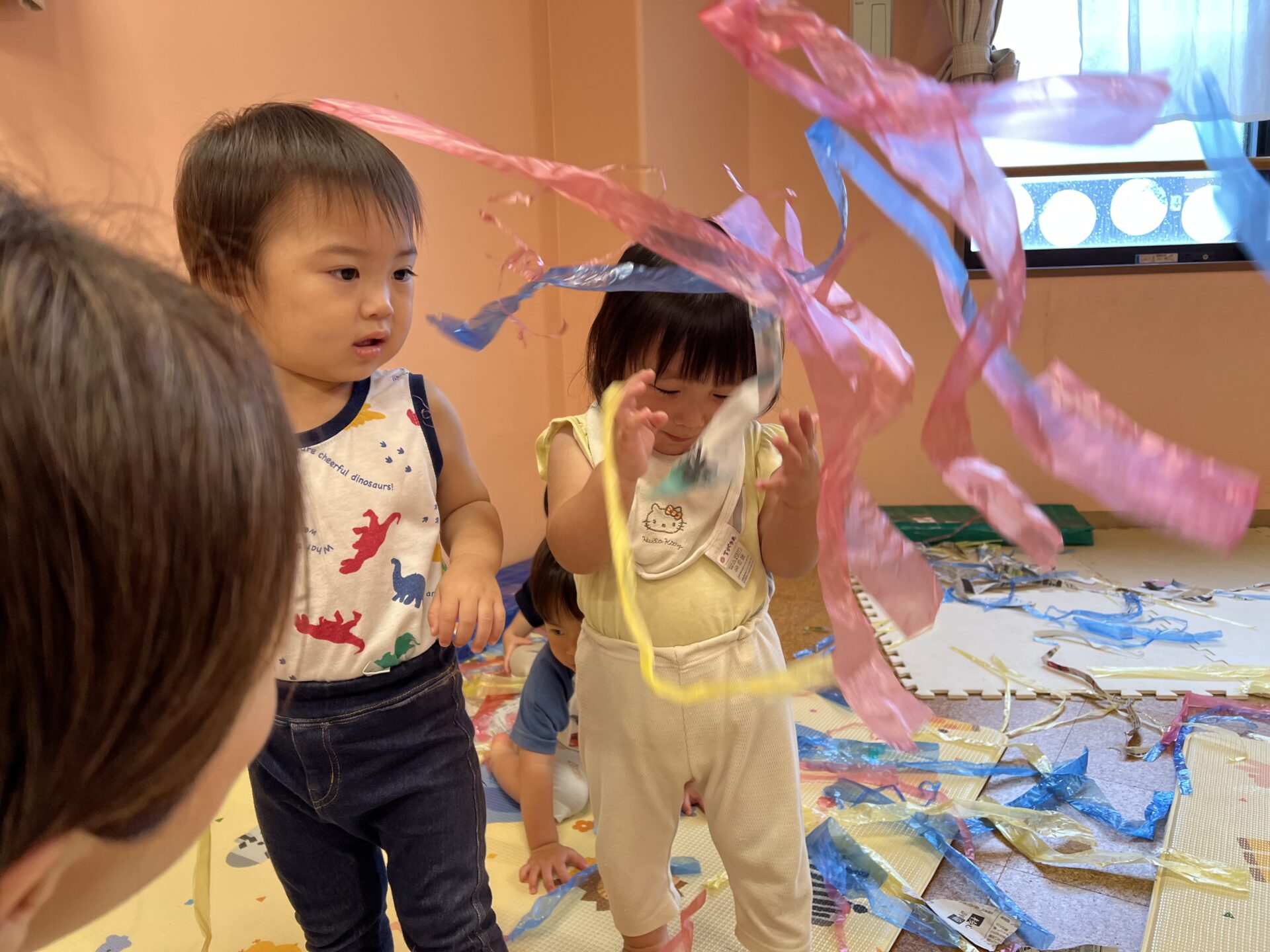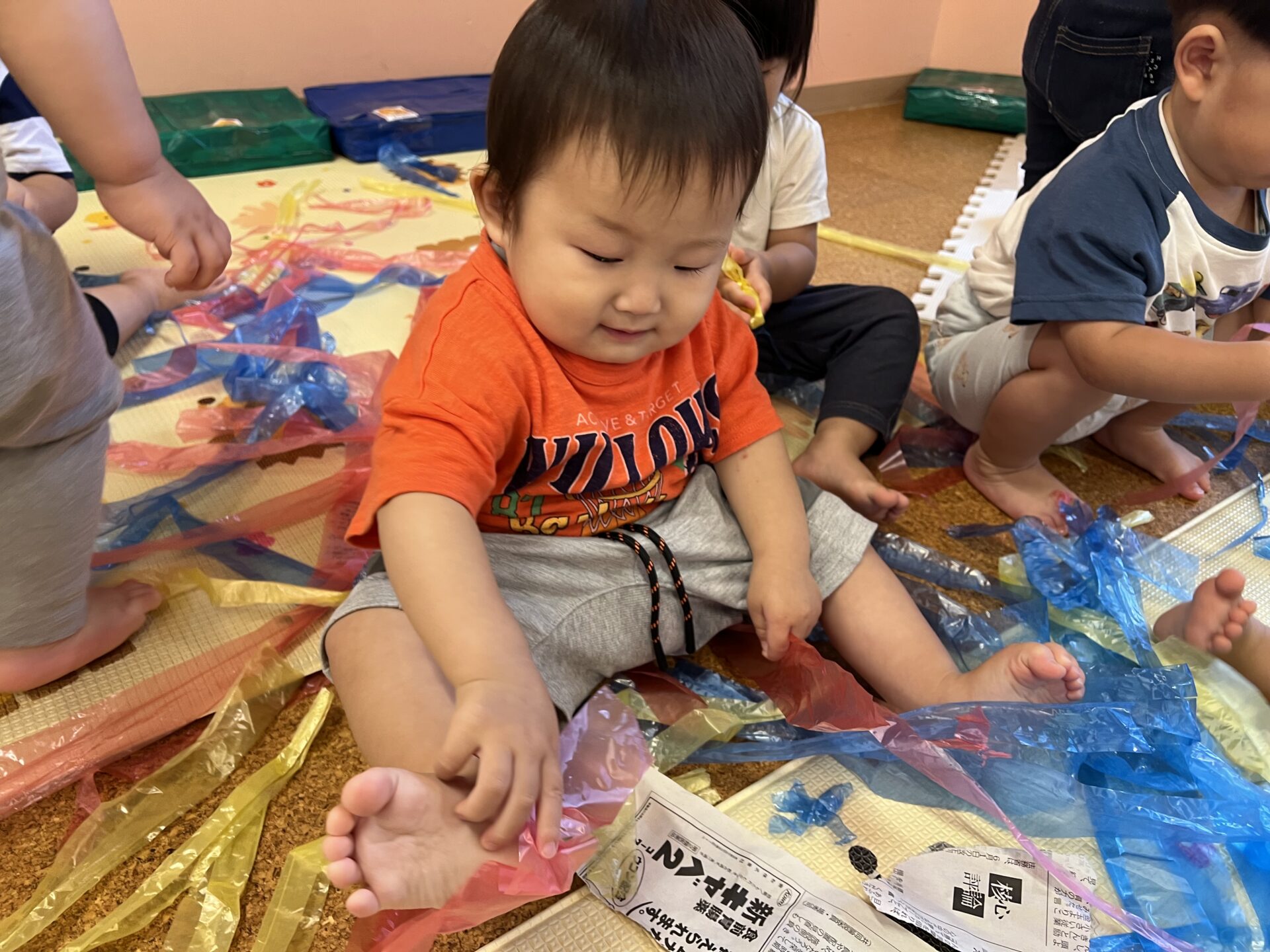 1歳児・だいちチームさんは、新聞紙とすずらんテープ遊びで大盛り上がり😊