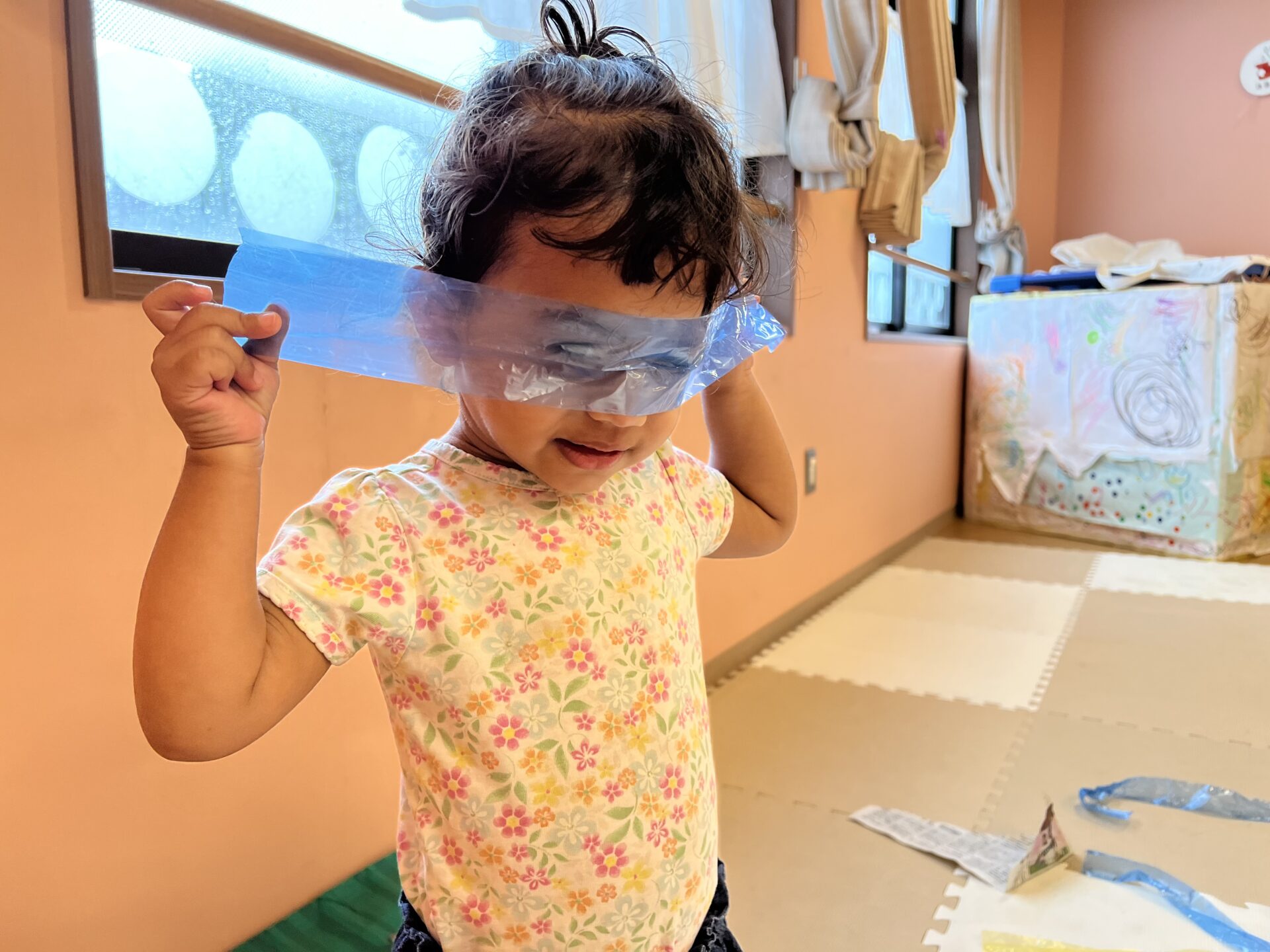 ほとんどのクラスが、七夕の製作で使用していたすずらんテープ😊乳児クラスでも、すぐにビリビリする事ができて楽しい遊びです。Sちゃんは、色めがね👓のように顔にあてていました😄